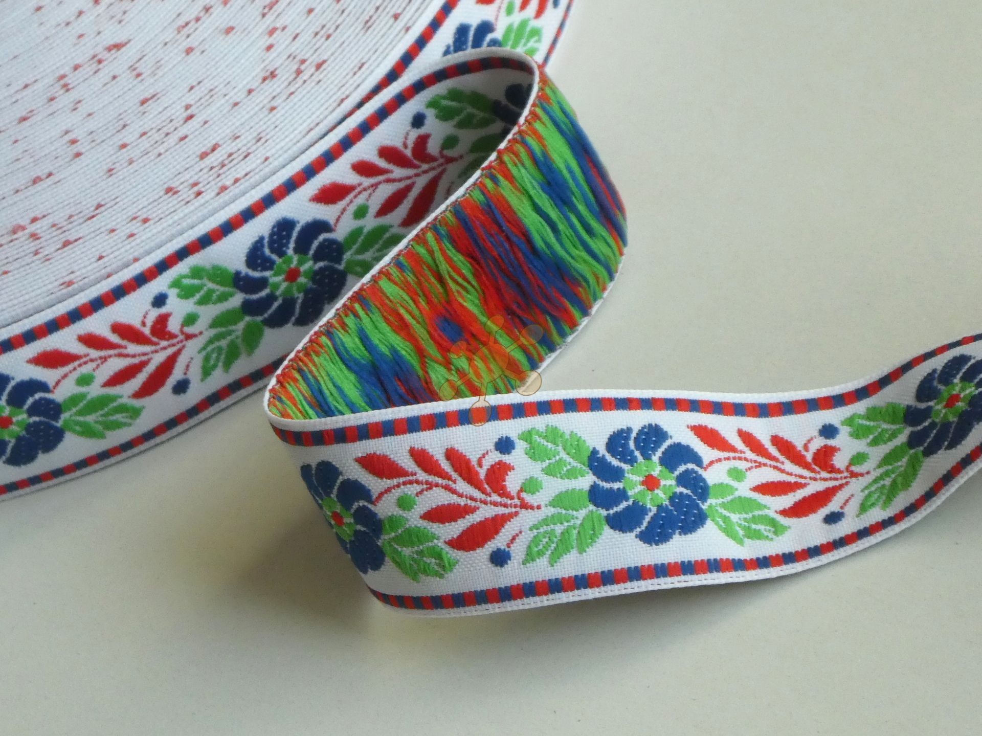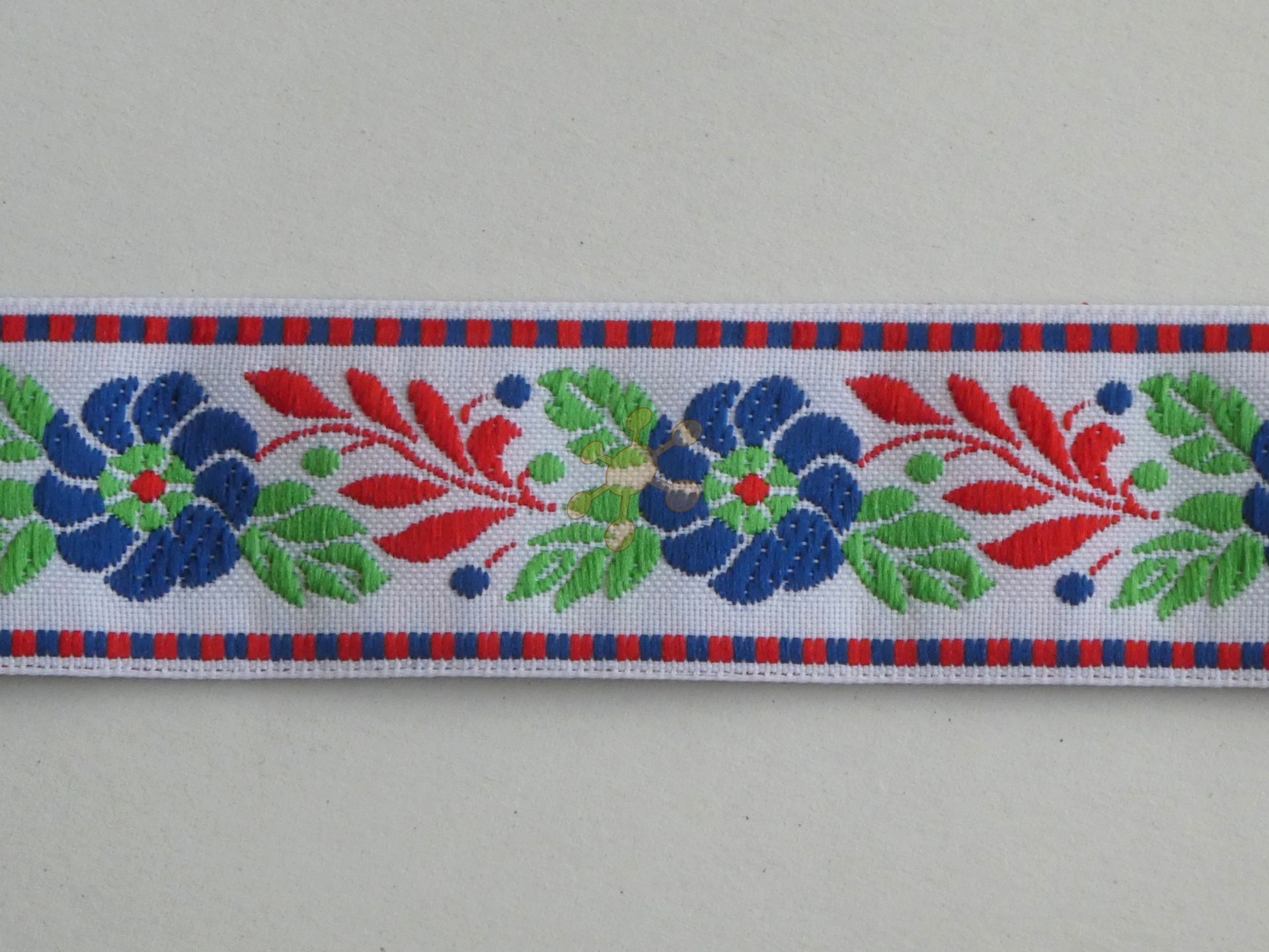 Vyšívaná stuha - krojovka v šírke 25mm, biele a červené kvety vyšívané vzor na čiernej. Stále obľúbený materiál na zdobenie oblečenia, ľudových krojov, doplnkov, ako čelenka do vlasov či motýlik, darčekových predmetov...
