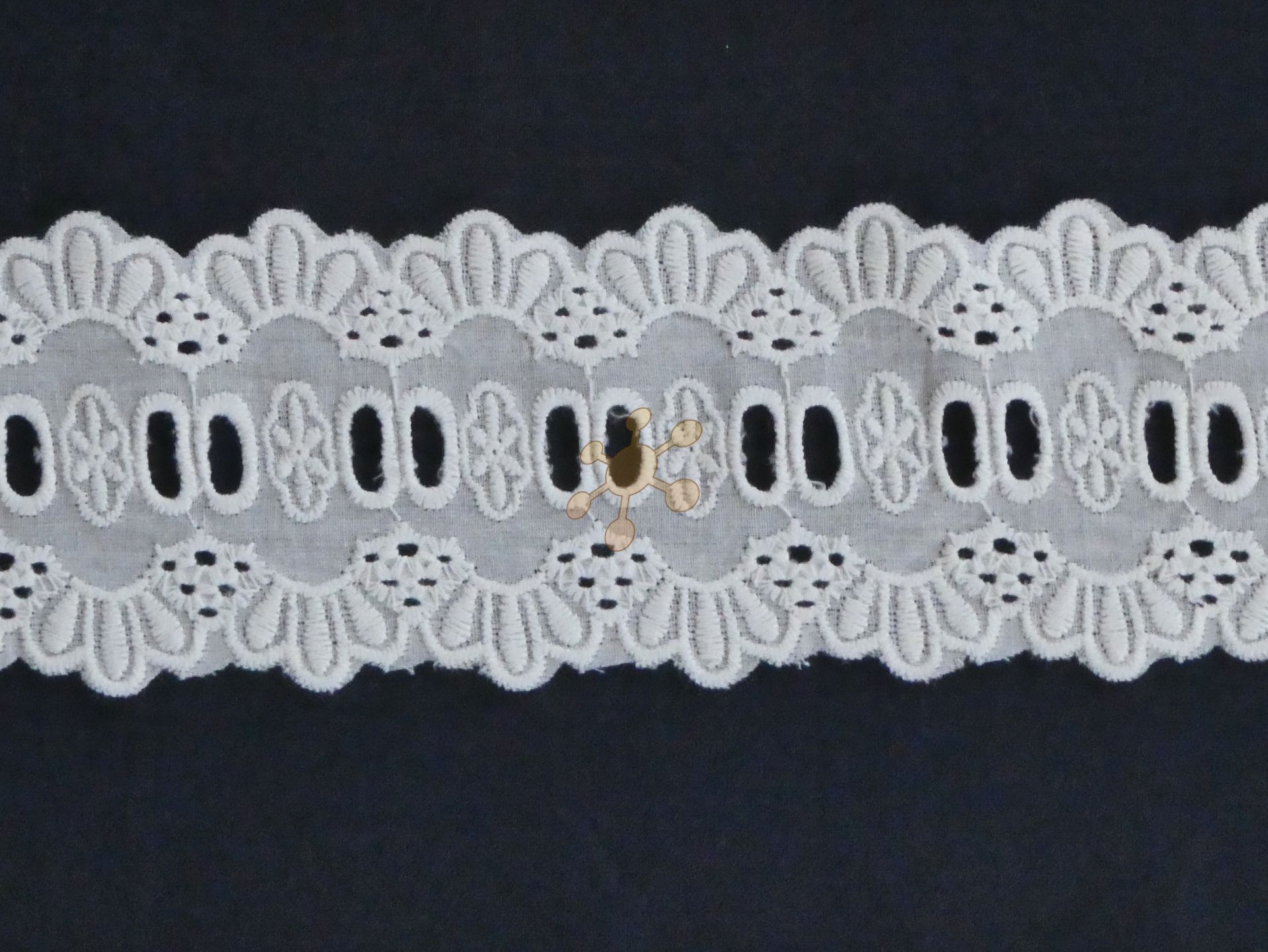 Vyšívaná bavlnená čipka alebo vsadka s možnosťou prevliecť stuhu, pre skrášlenie odevov, krojov, bytových a rôznych doplnkov.