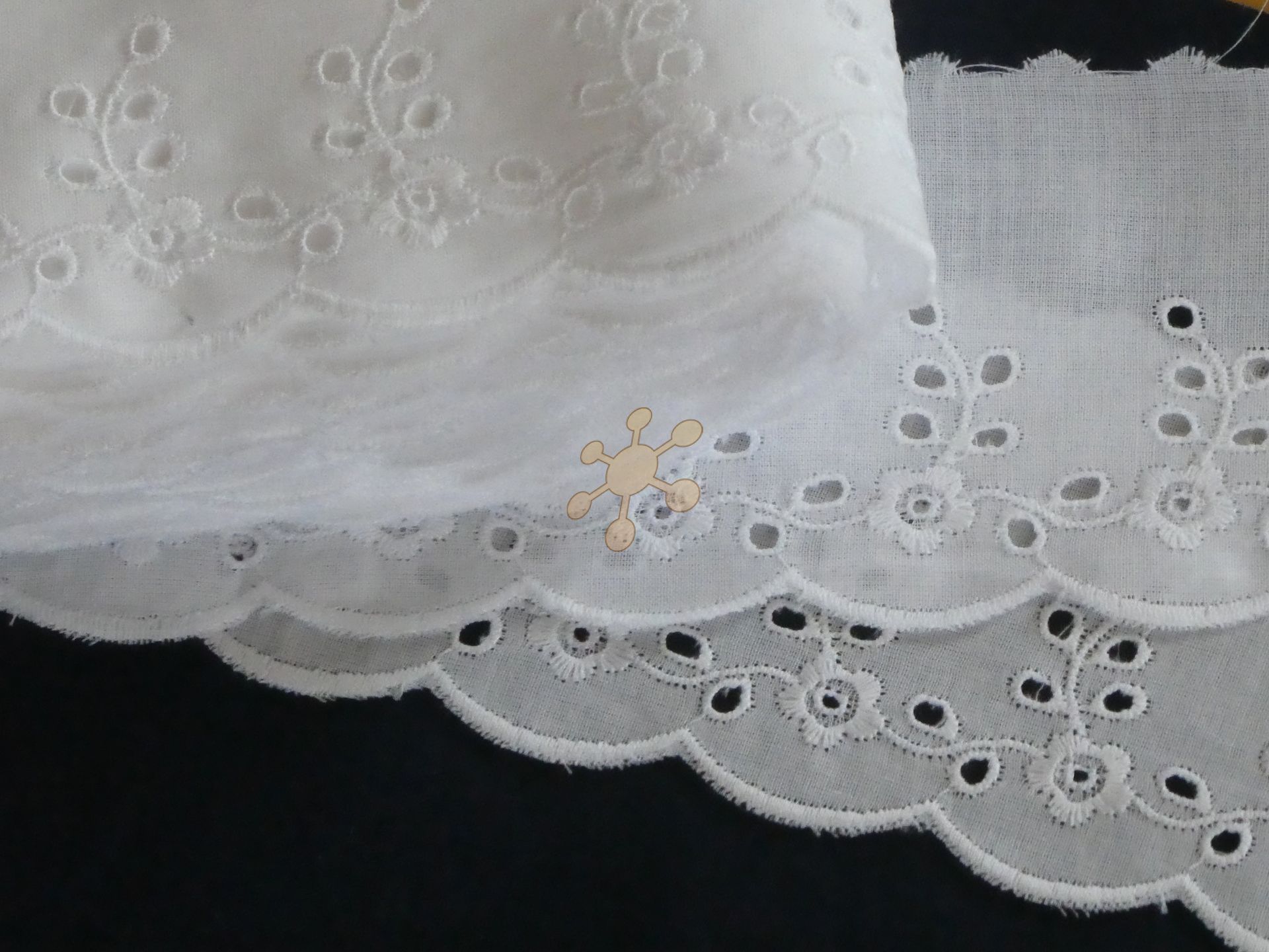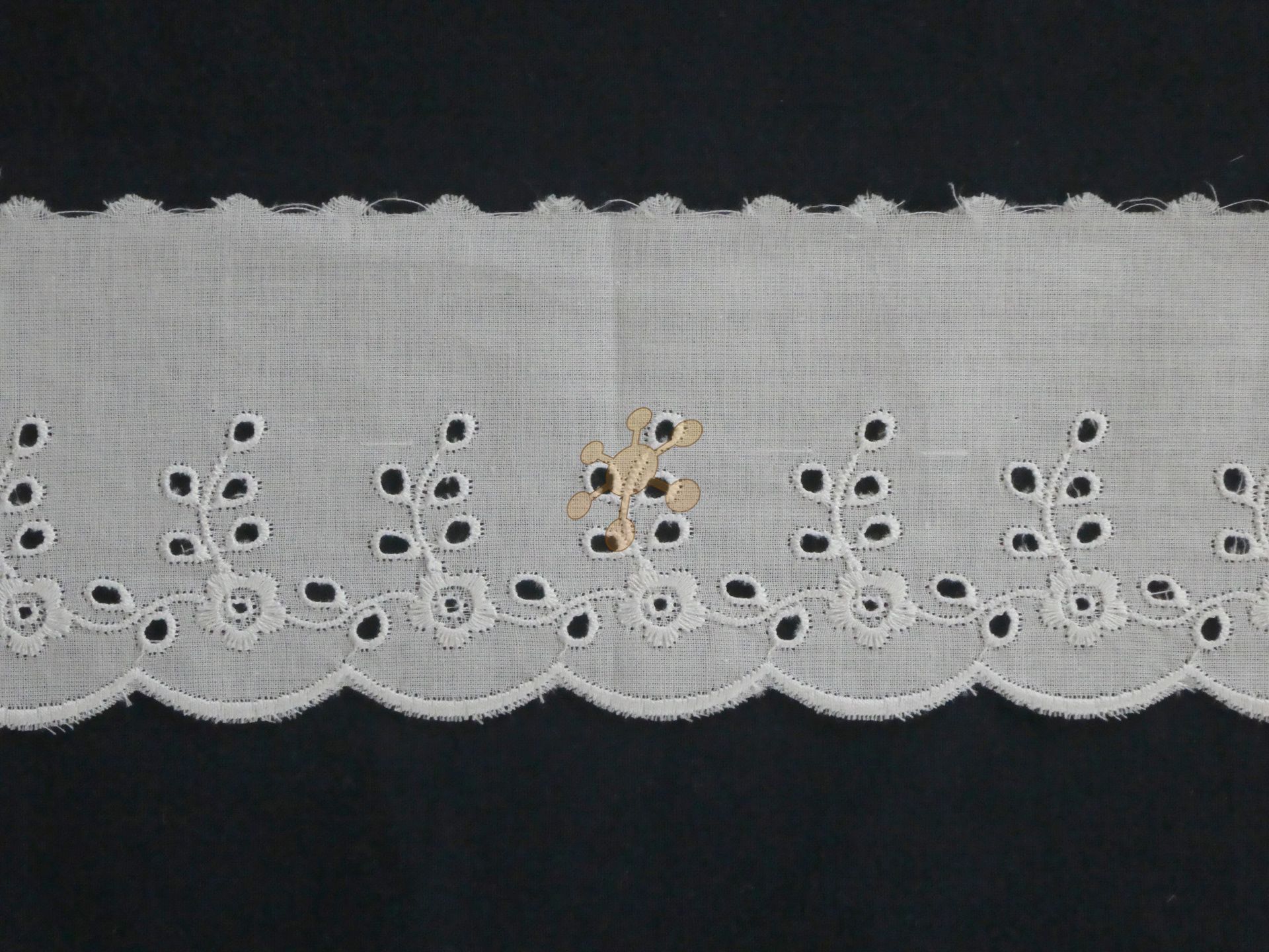 Vyšívaná biela bavlnená čipka s kvietkami pre skrášlenie odevov, krojov, bytových a rôznych doplnkov.