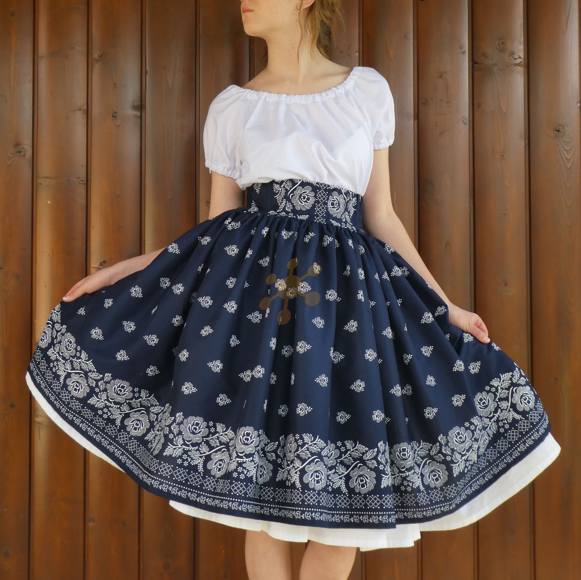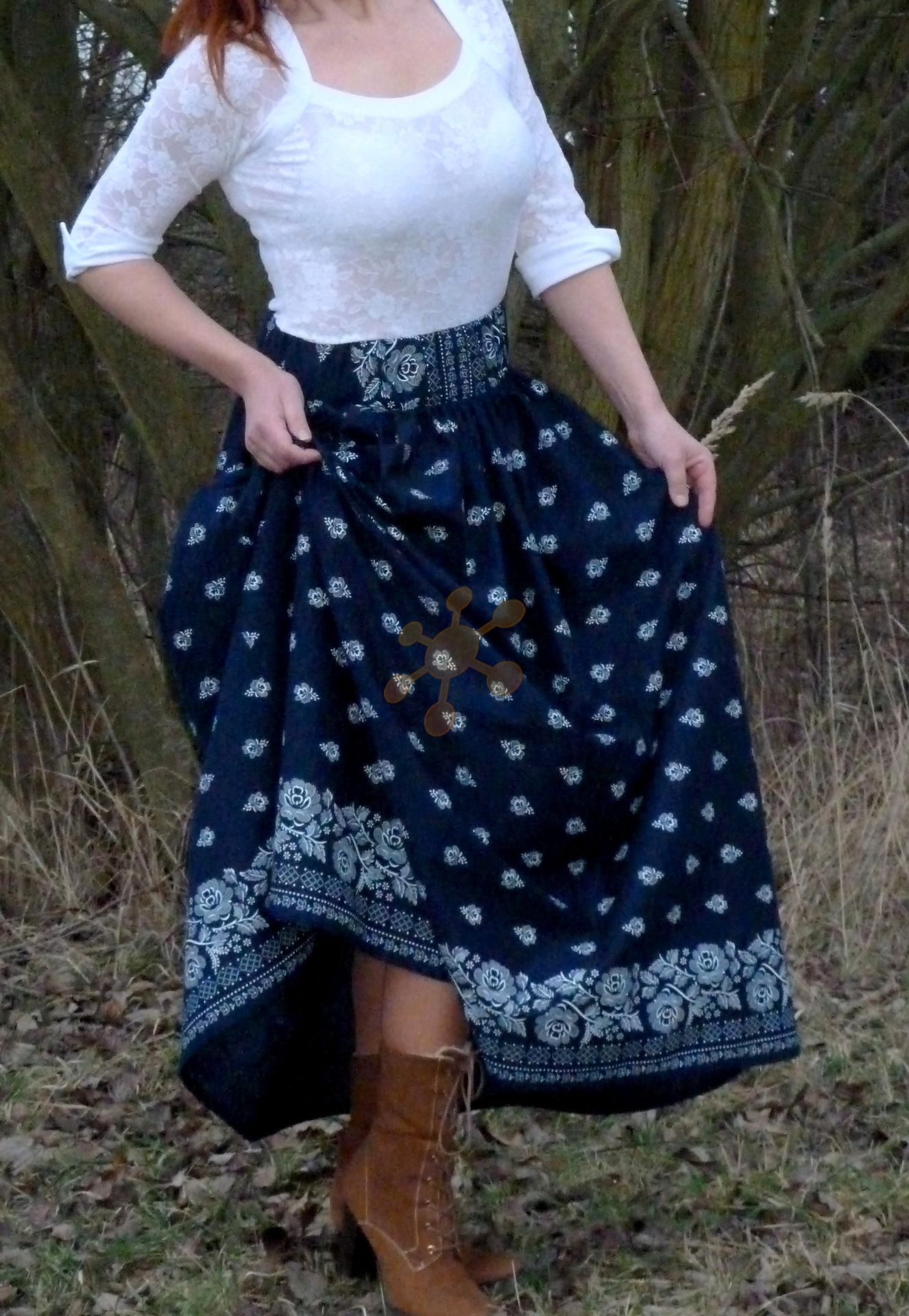 Suknica dlhá v tradičnom vzore z bavlneného plátna Bordura Folk na tmavomodrej, 100% bavlna, 135 g / m2, látka čiastočne vyzrážaná parou. Bohato riasená, v páse 8 cm široká guma, v strede zrkadlovo riešená bordúra. Prať do 40°C, odporúčam prať vyvrátené a žehliť na ruby. Možnosť ušiť z rôznych látok...