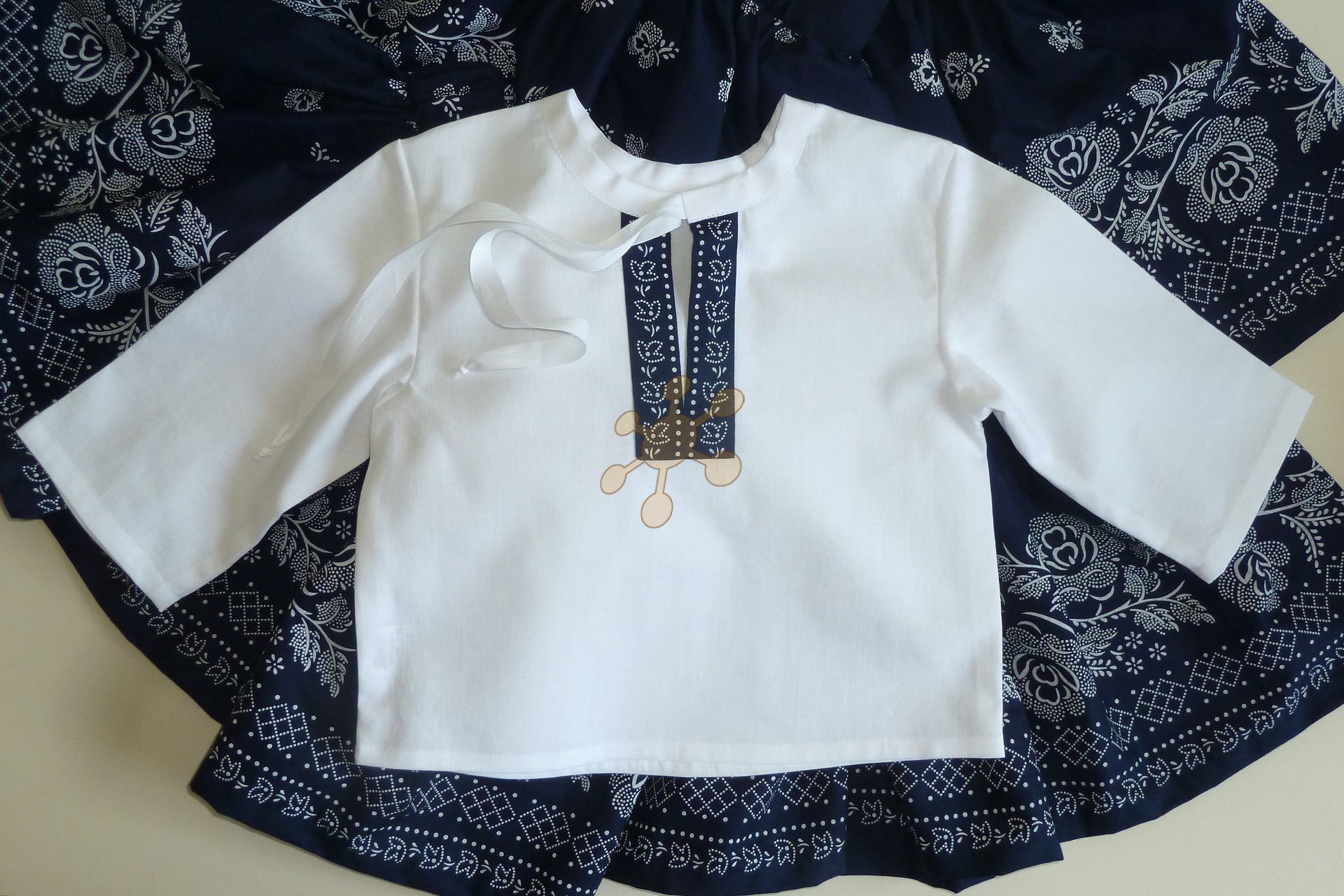 Jemné príjemné plátno, biely ľudový vzor na tmavomodrom podklade, bordúra kvetov po oboch stranách, vhodné na oblečenie, sukne, kroje, šaty, posteľné prádlo, vankúš, obrus...