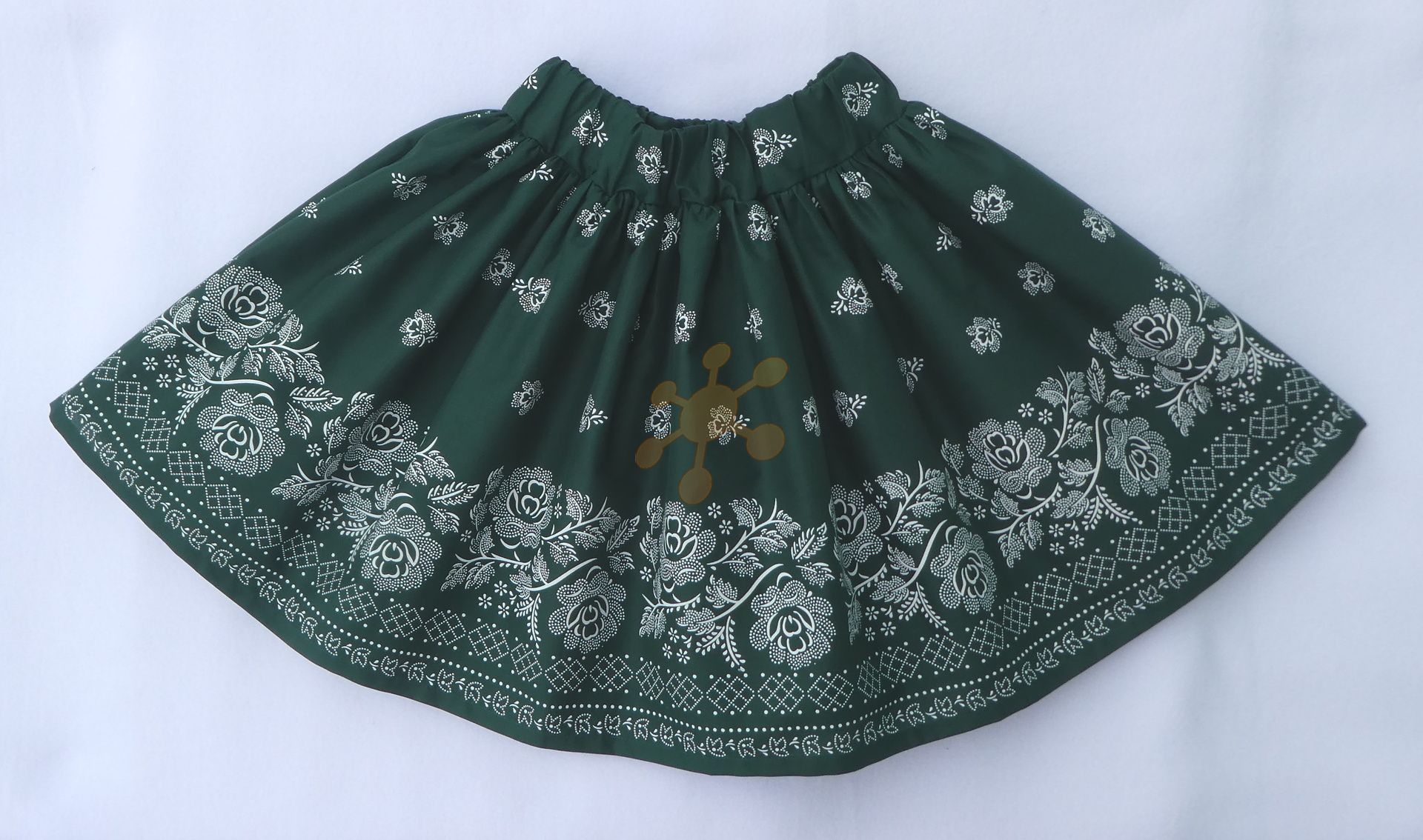 Jemné príjemné plátno, biely ľudový vzor na tmavozelenom podklade, bordúra kvetov po oboch stranách, vhodné na oblečenie, sukne, kroje, šaty, posteľné prádlo, vankúš, obrus...