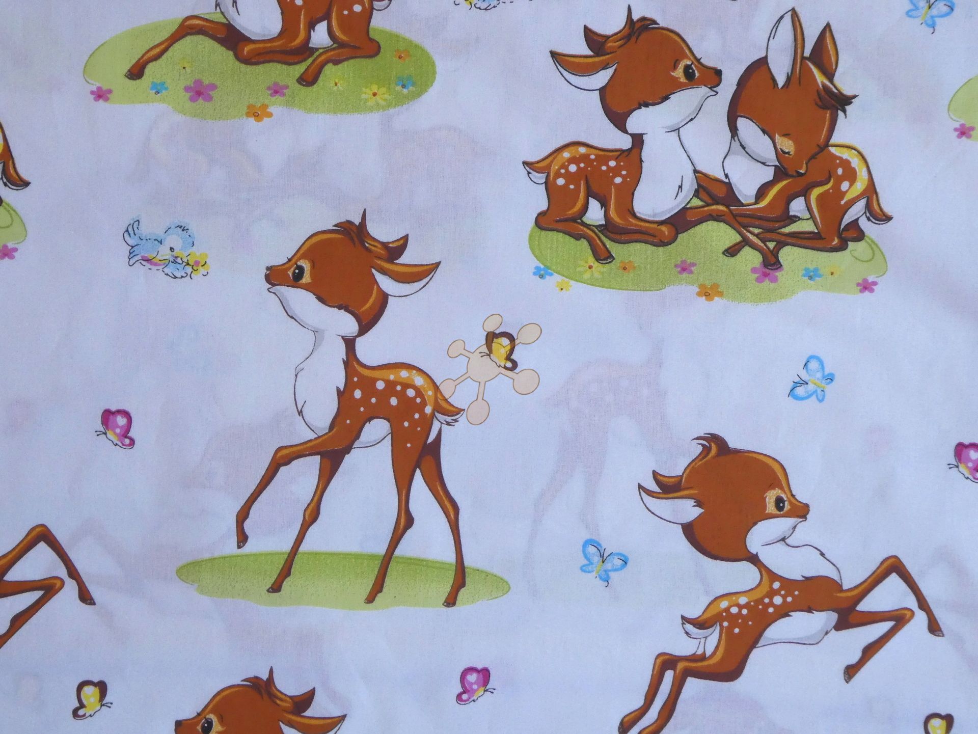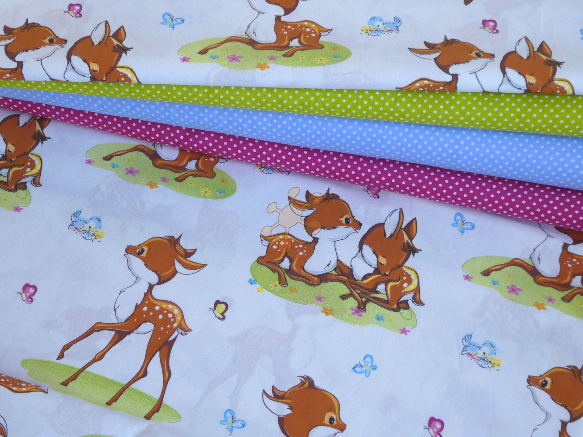 Príjemný bavlnený popelín, veselí srnčekovia na bielej, materiál je ideálny na detské obliečky, pažamko, šatočky....