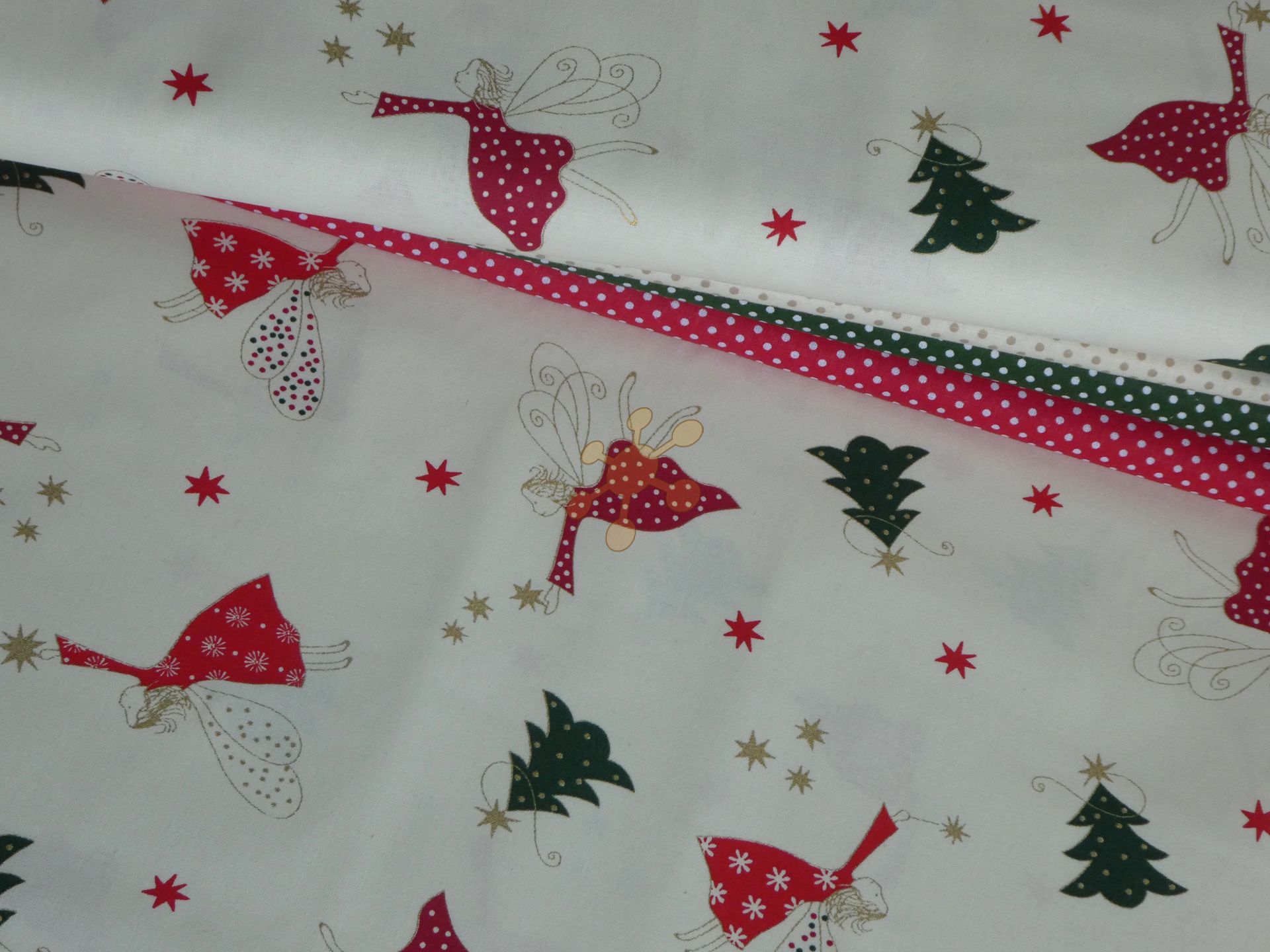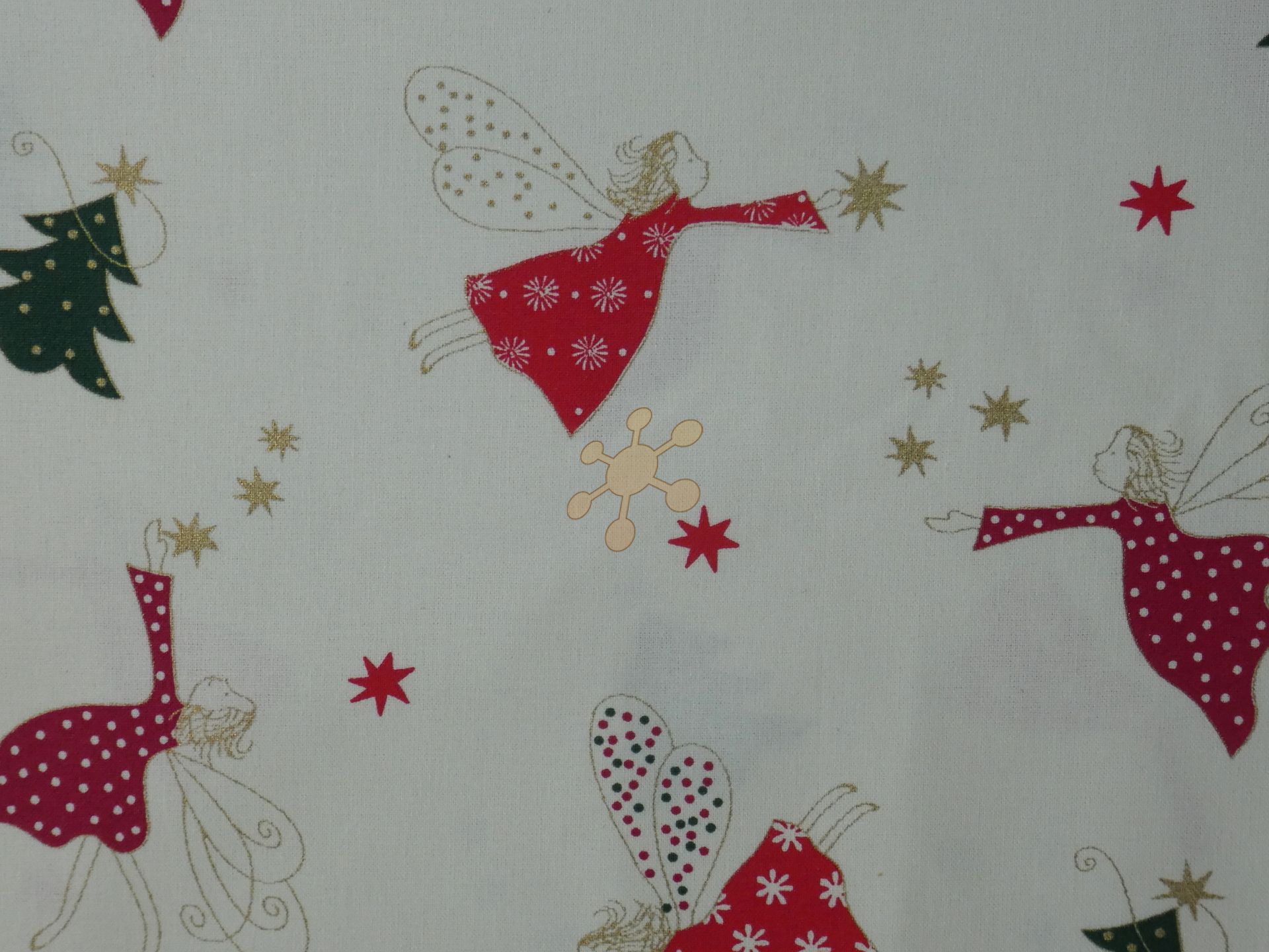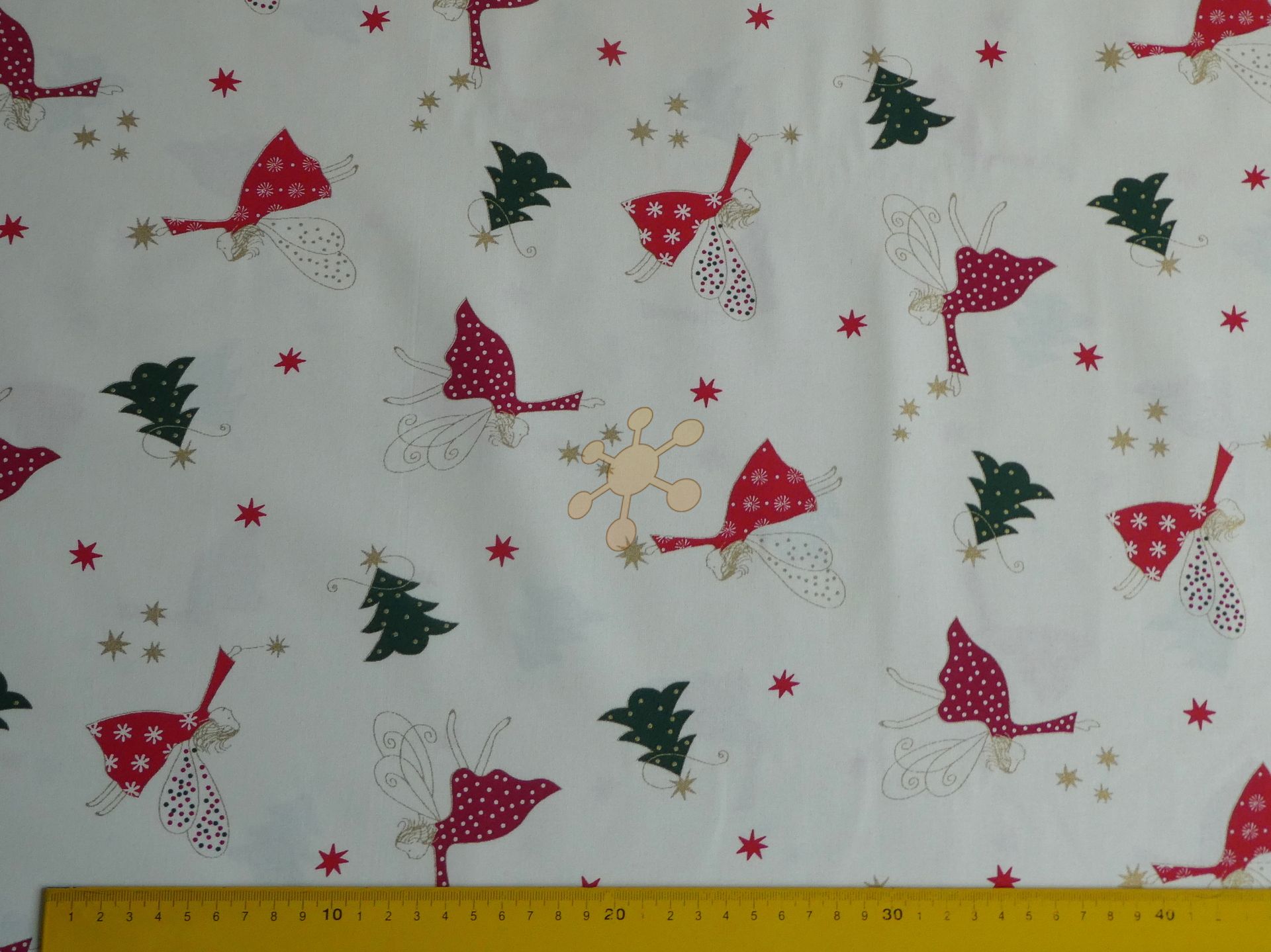 Bavlnené sviatočné plátno s potlačou anjelikov v červenej a bordovej farbe, zelenými stromčekami a jemne zlatou potlačou..