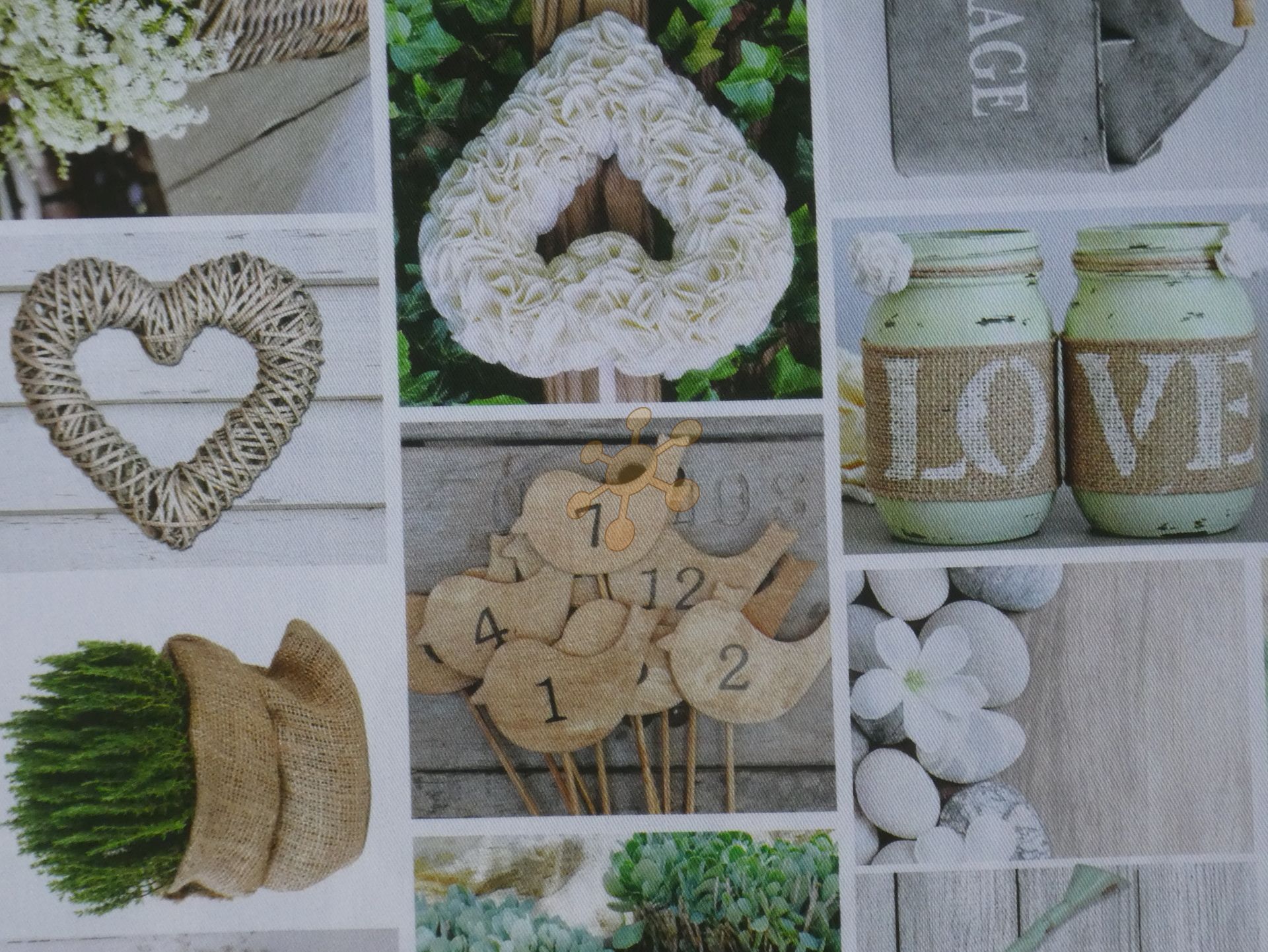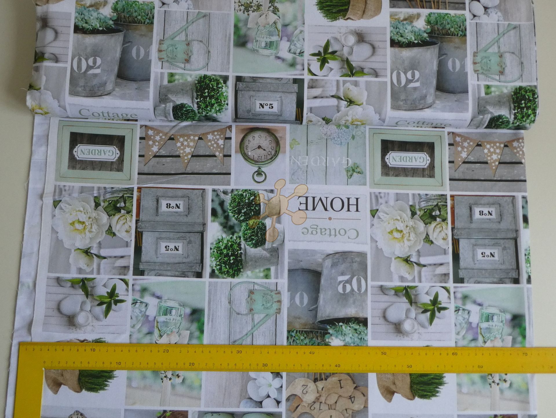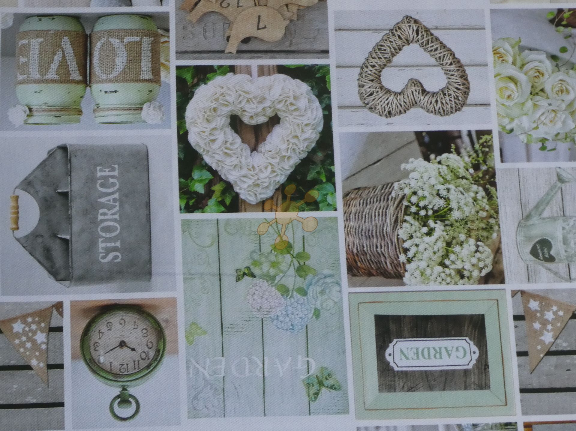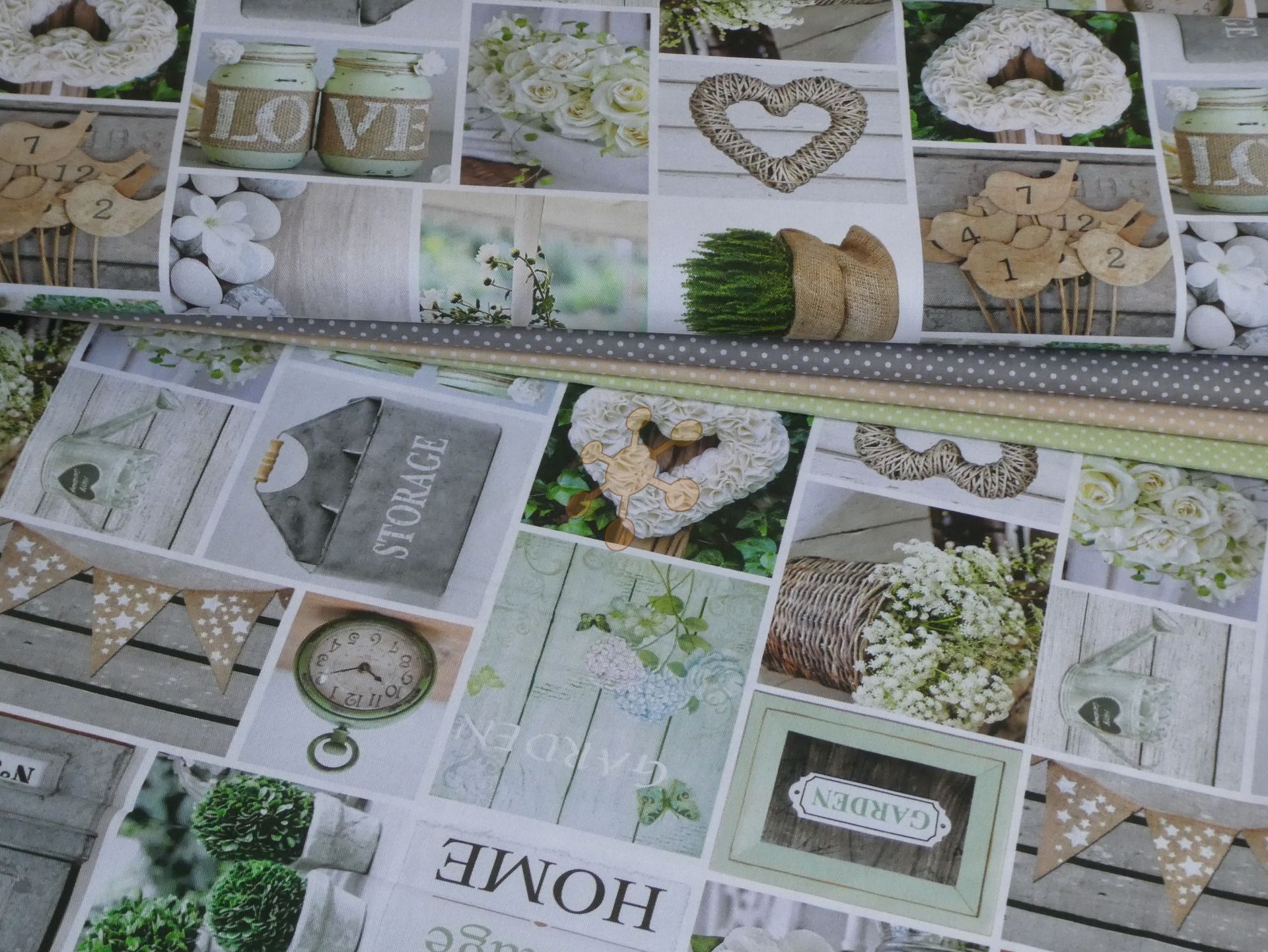 Domov vo vintage štýle, digitálna tlač, jemné mentolové a natur farby, pevnejšia kvalitná látka. Vhodné i na bytový textil.