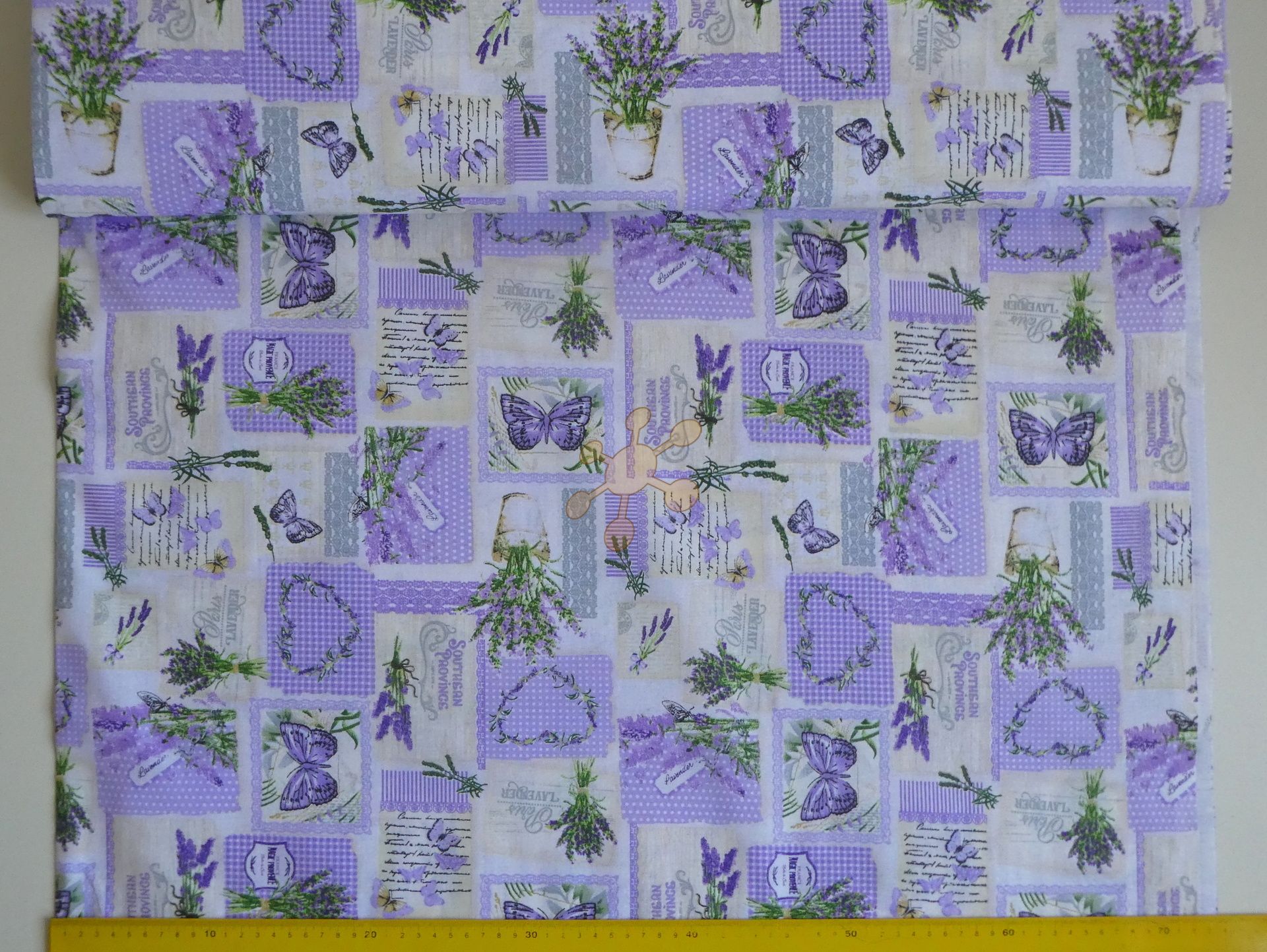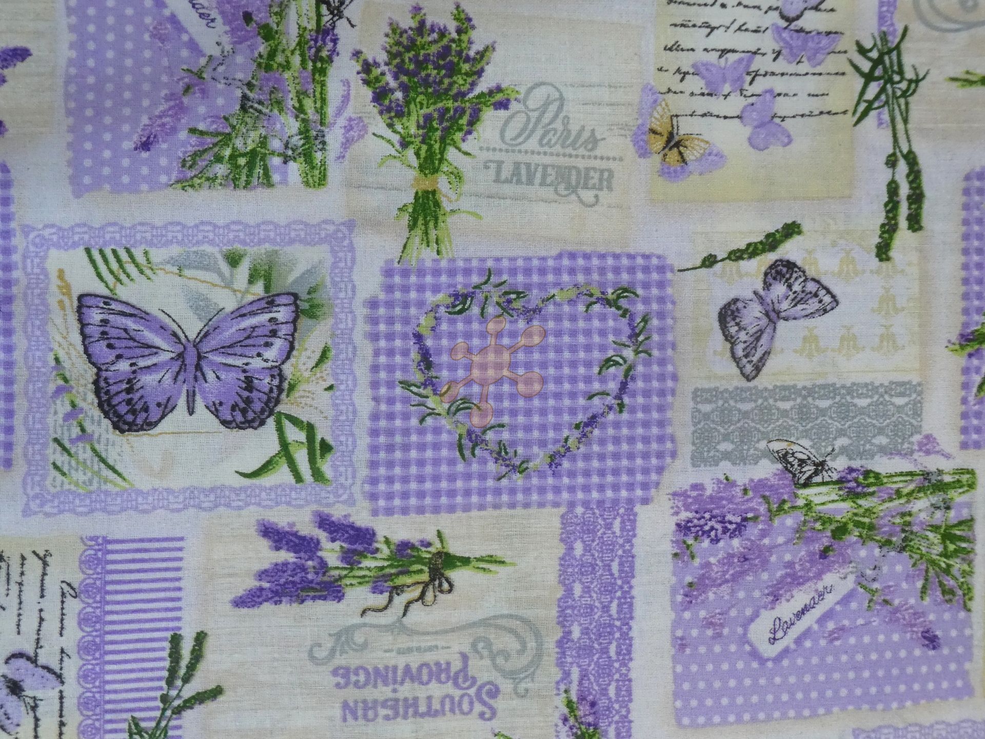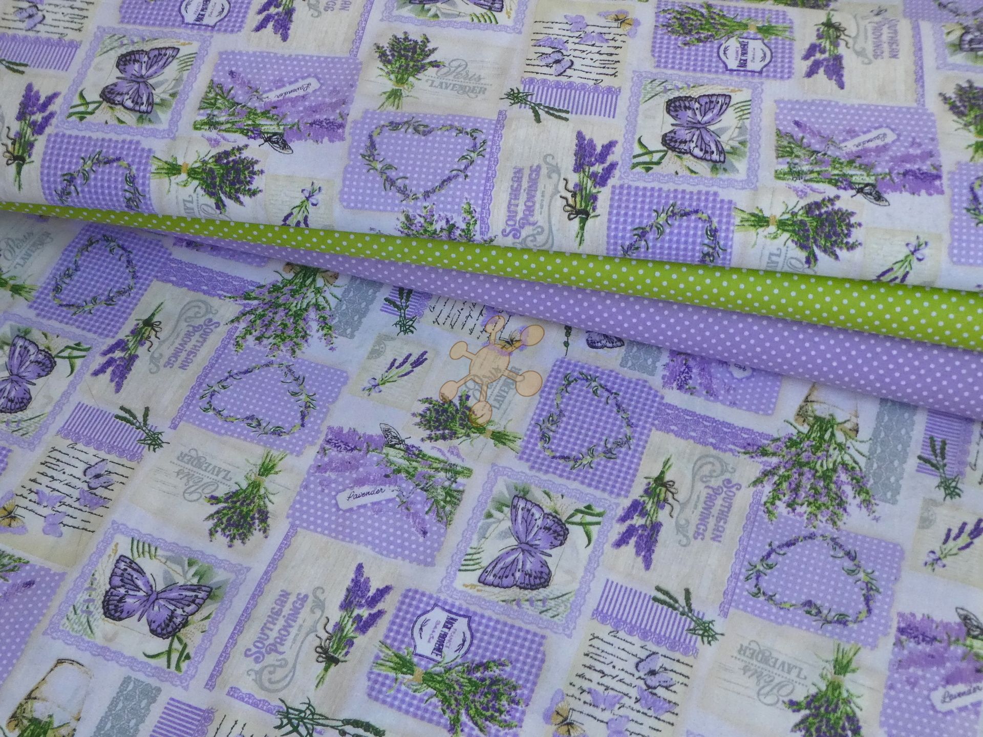 Bavlnené plátno s potlačou levanduľky a srdiečkok...