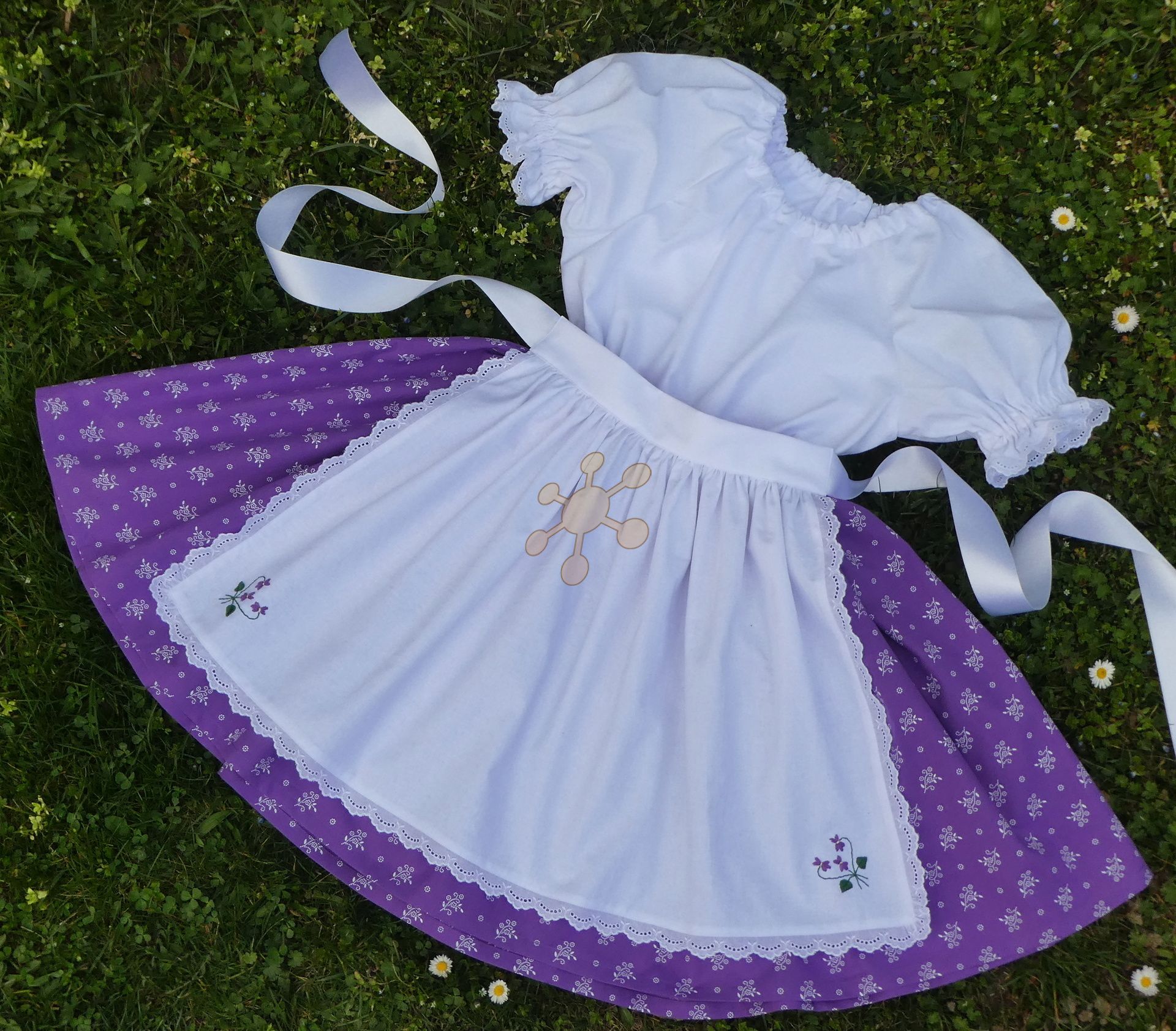 Dievčenská sukienka, biela potlač ľudového vzoru na fialovej, 100% bavlna, 135 g / m2.