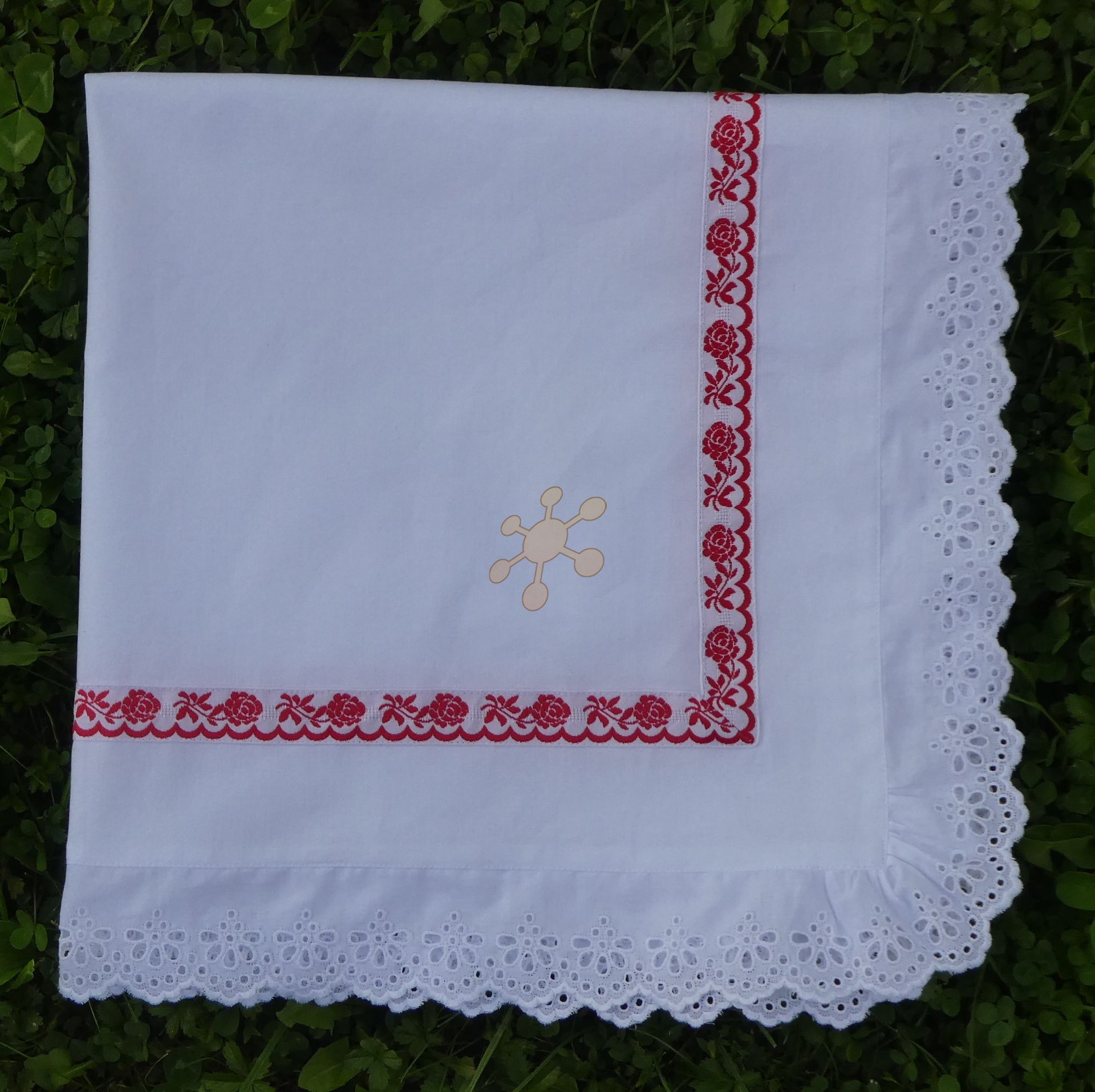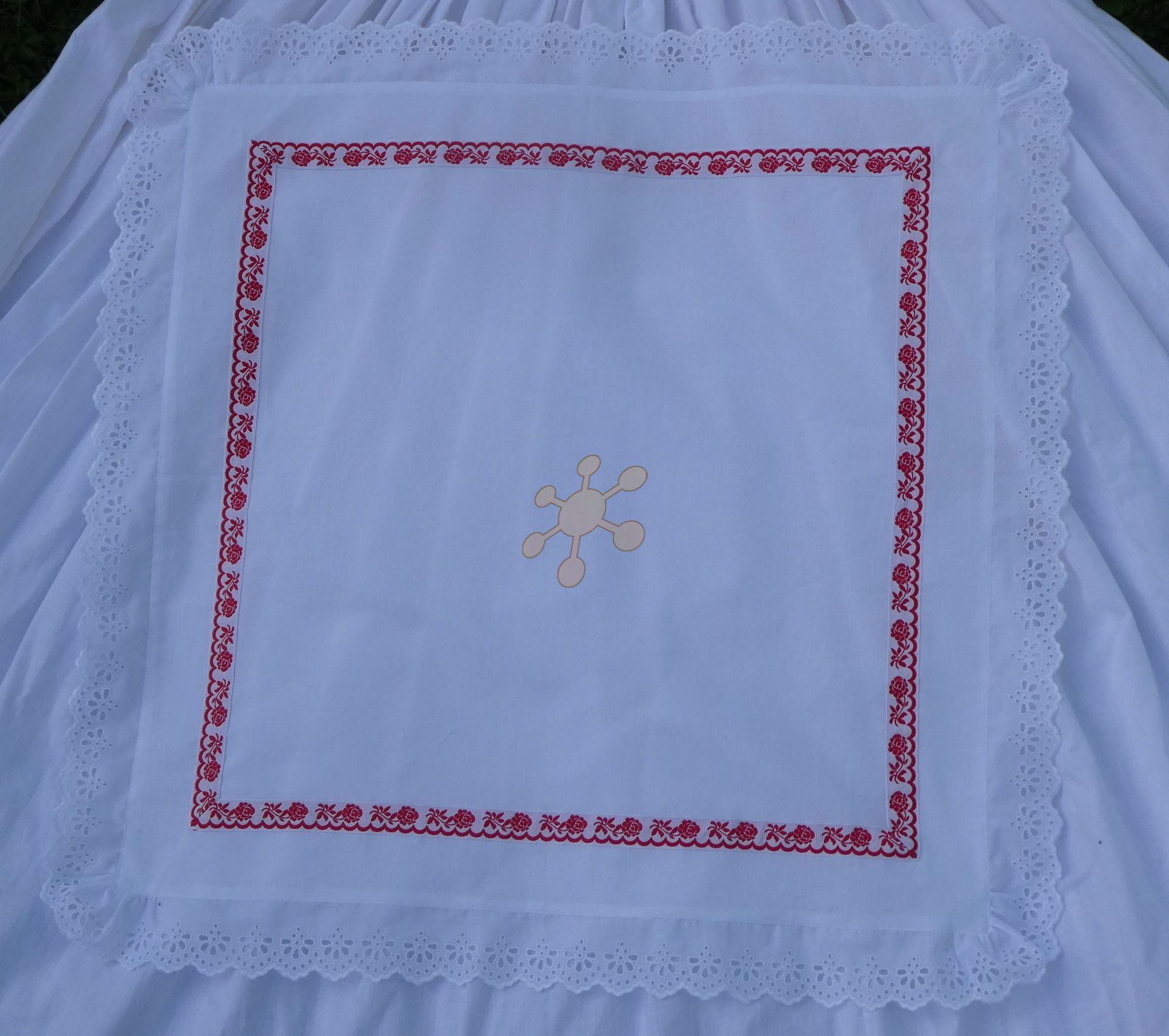 Svadobná šatka alebo obrúsok, dozdobená madeirou a krojovkou. Šatku viete využiť i na krst, fotenie bábätka a pod...