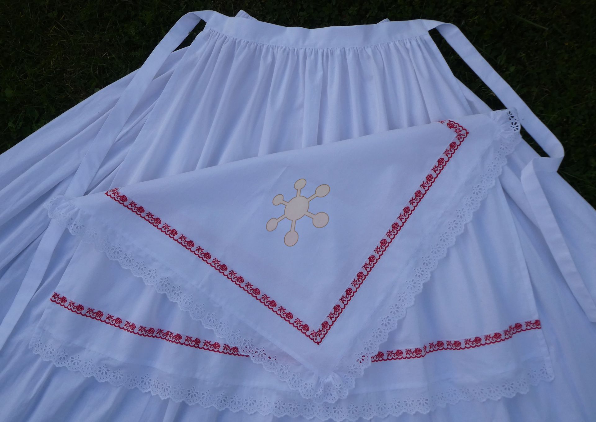 Ušitá z vyzrážanej 100% bavlny, 145 g, dozdobená madeirou Polkvet a krojovou stuhou Červené ruže v šírke 2 cm. Vyzrážaná je i krojovka, lebo pri prvom praní sa mierne zráža.