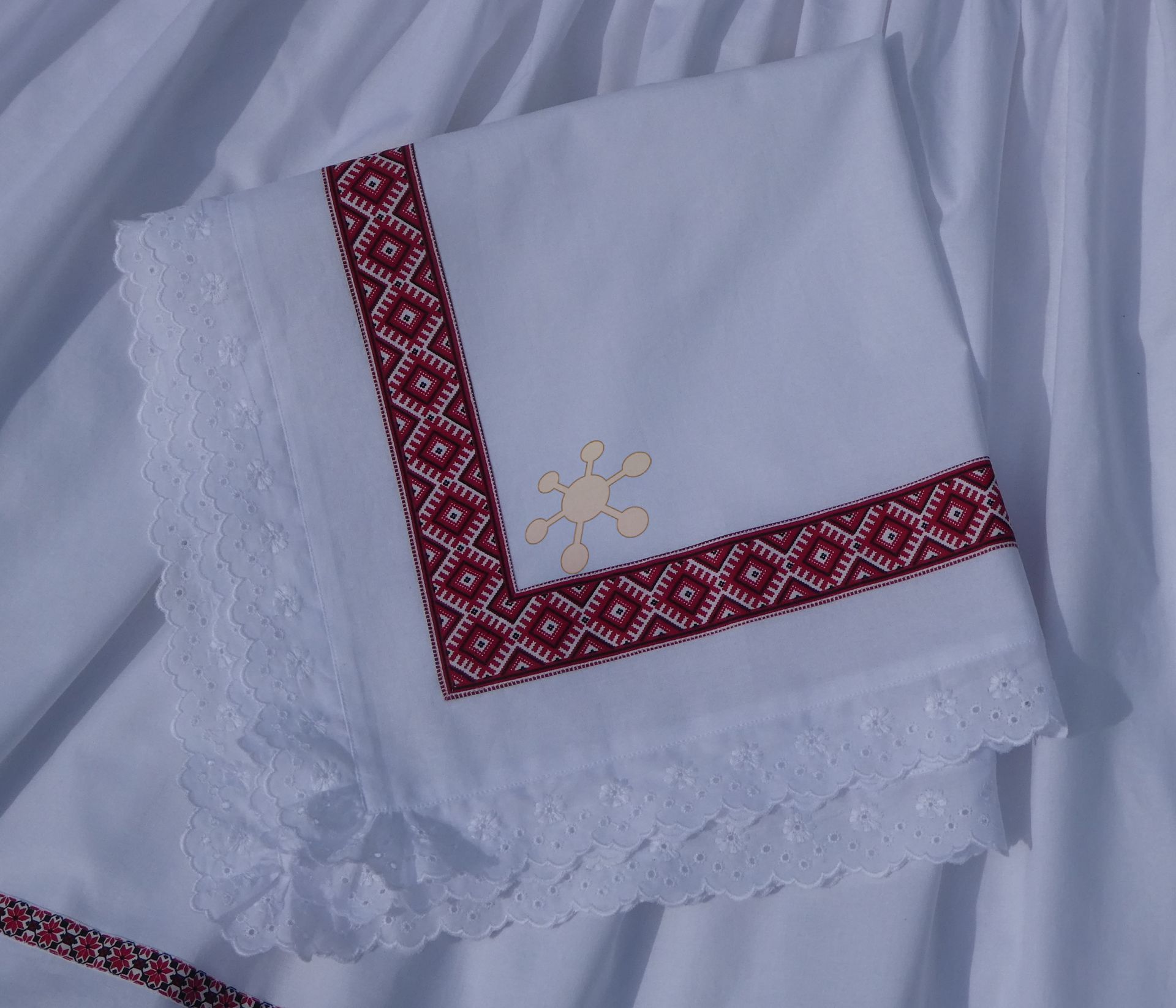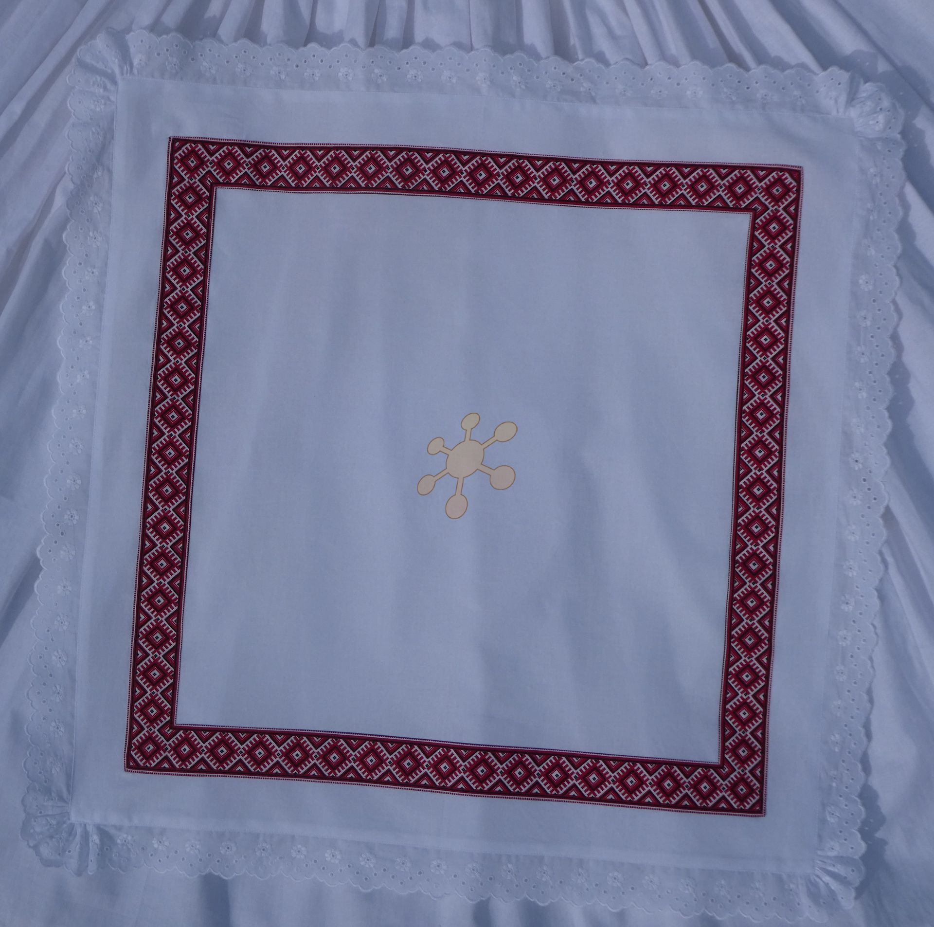 Svadobná šatka na čepčenie, v ľudovom duchu. Šatku viete potom využiť napr. i na fotenie s bábätkom... Možno ušiť v červenom, modrom, zelenom a hnedom doladení.