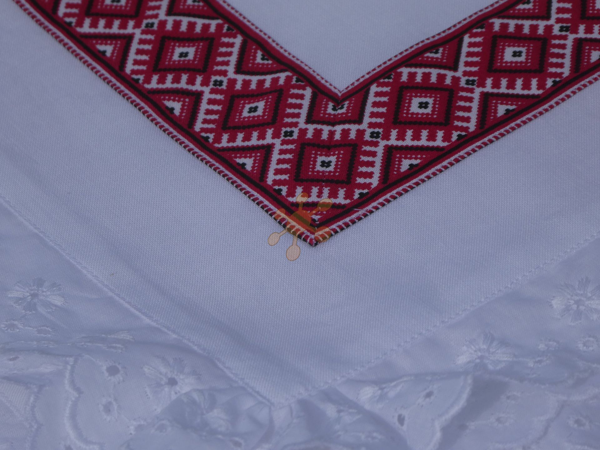 Ušitá z vyzrážanej 100% bavlny, 145 g, dozdobená madeirou Margarétky a ozdobným pruhom z látky Vyšívané folk pruhy, potlač evokuje výšivku. Rozmer 65 x 65 cm.