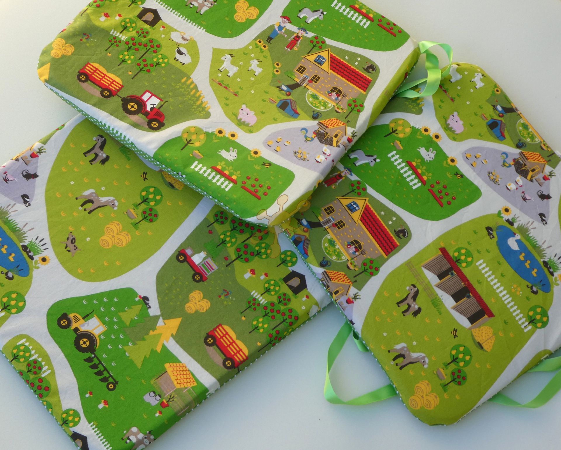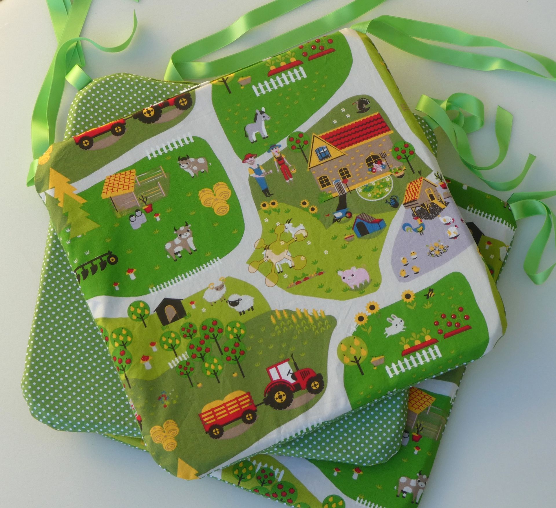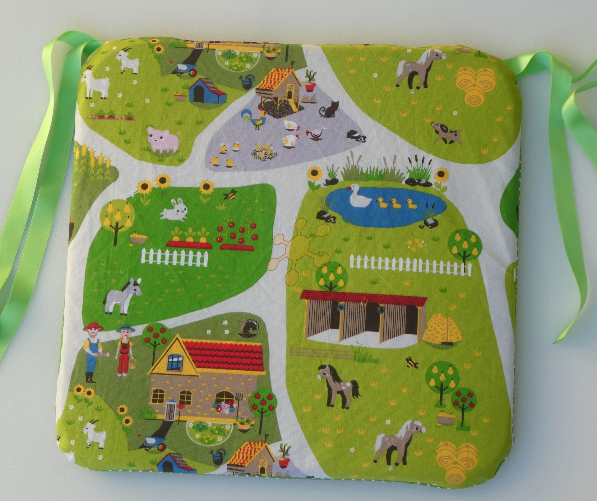 Detský sedák na cestovanie alebo do školy, v rozmere 35 x 35 cm s mierne zaoblenými rohmi, so saténovými mašličkami na uviazanie. Obe látky 100% bavlny, vopred vyzrážané, aby i po prvom opraní zostal tvar sedáka rovnaký a aby sa nekrútil. Mašličky sú orientované na roh, konce sú opálené, aby sa nestrapili. Ak potrebujete viazanie do zadu alebo viac na boky, dá sa ušiť i tak. Nie všetky stoličky v škole alebo doma sú vyrobené rovnako :) Rozloženie vzoru sa môže mierne líšiť.