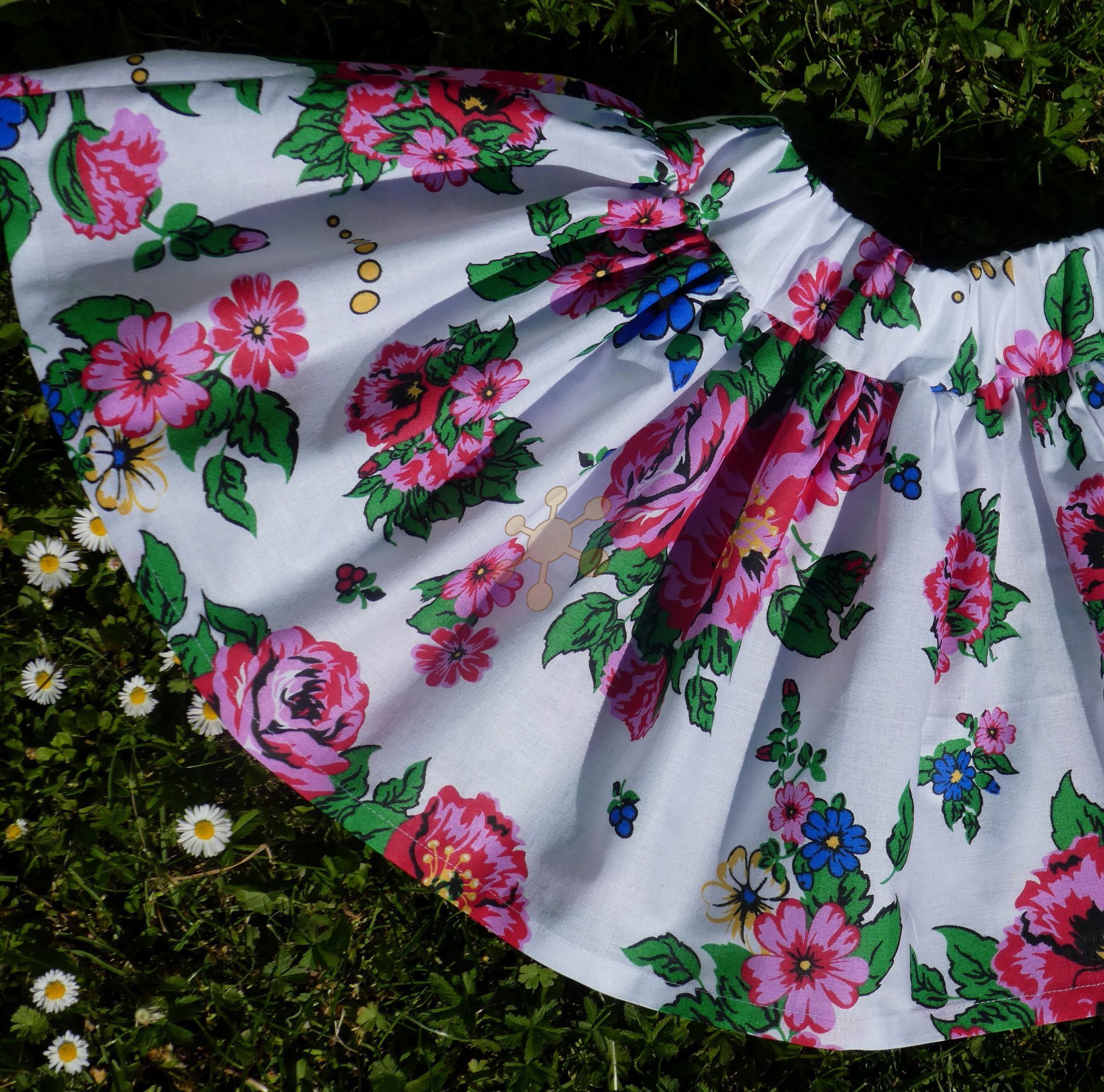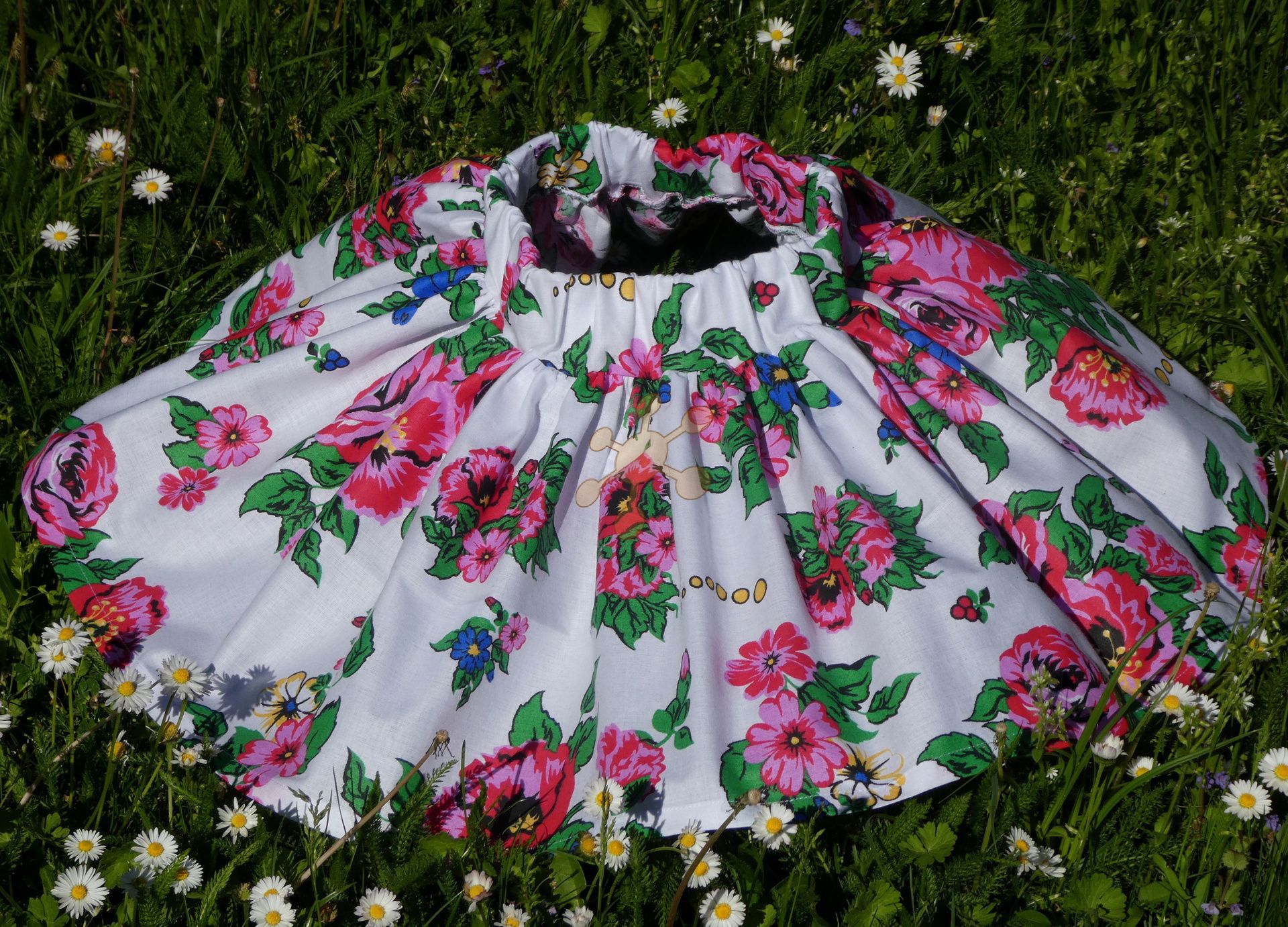 Dievčenská bavlnená sukienka v ľudovom duchu, riasená do pásu, v páse 3,5 cm guma, 100% bavlna, látka čiastočne vyzrážaná parou.