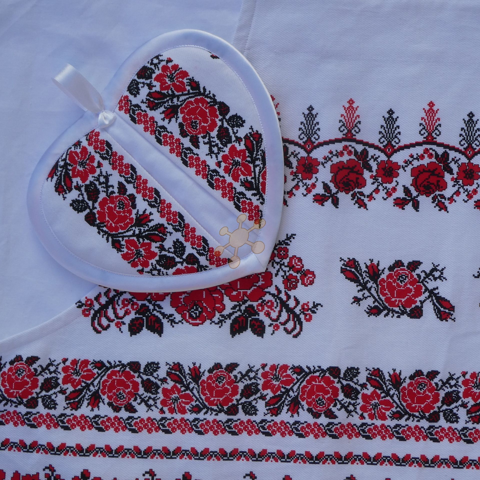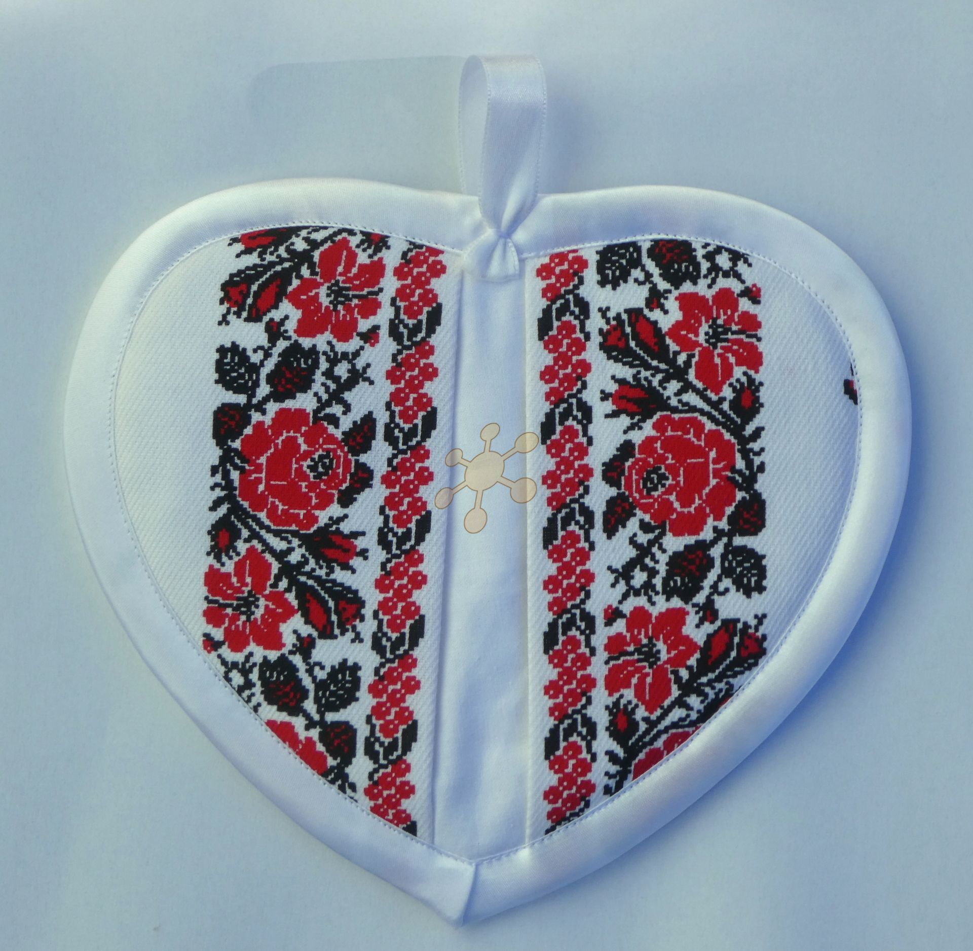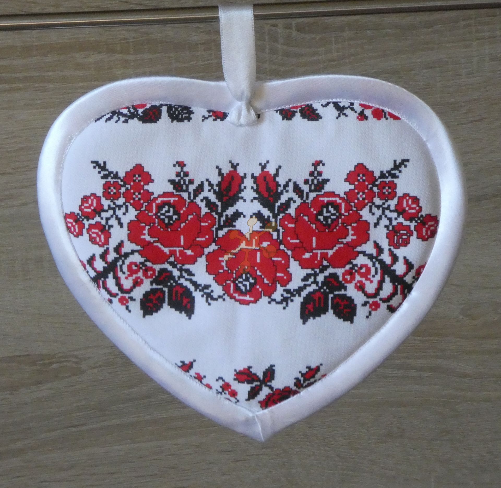 Kuchynská chňapka v tvare srdiečka ušitá z vyzrážanej 100% bavlny, 175 g, potlač evokuje výšivku ľudového vzoru. Vnútri 2 x fleece, podšitá bielou bavlnou, saténové uško na zavesenie. Veľkosť UNI.
