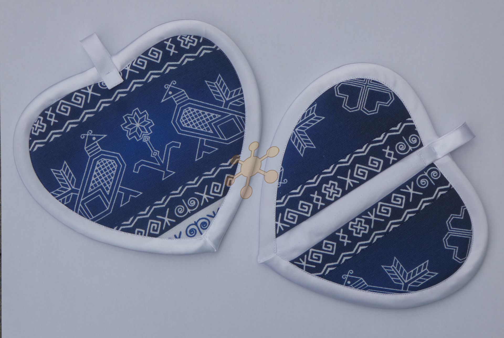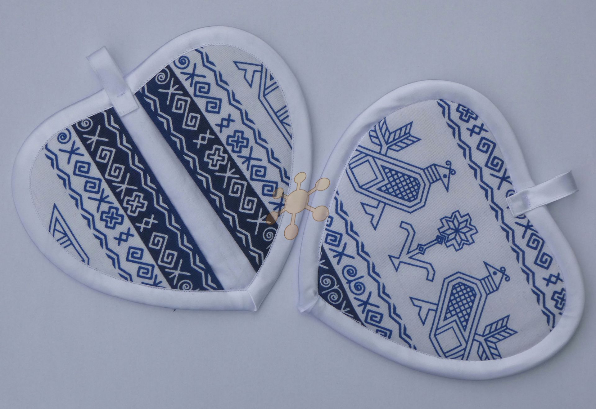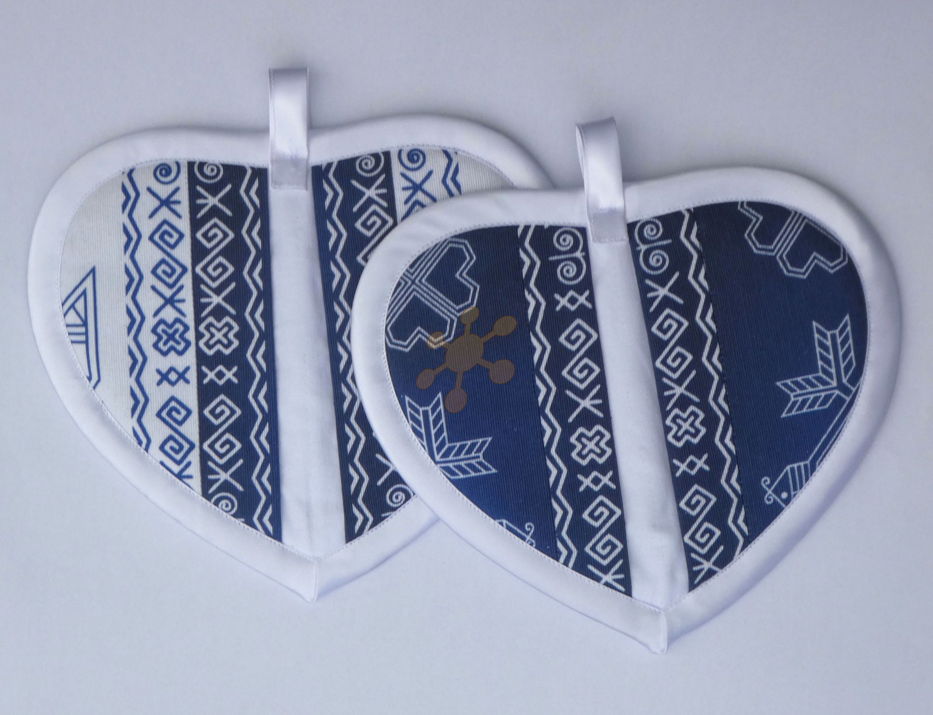 Kuchynská chňapka v tvare srdiečka ušitá zo zmesovky 50% bavlna + 50% polyster,. Vnútri 2 x fleece, podšitá bielou bavlnou, saténové uško na zavesenie.