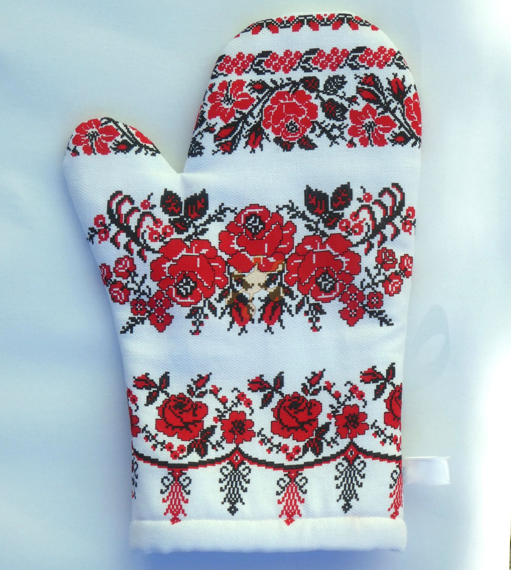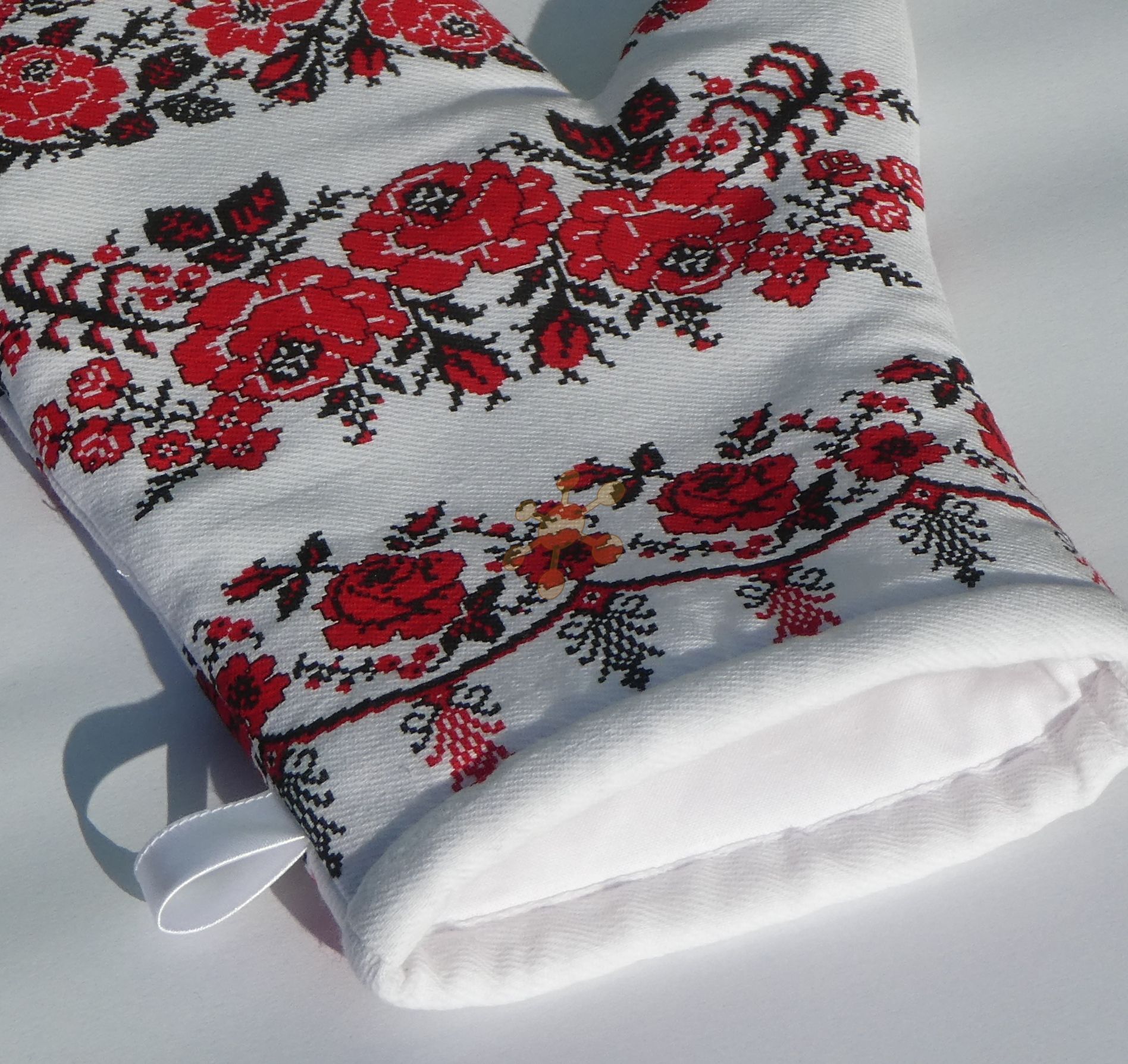 Kuchynská rukavica ušitá z vyzrážanej 100% bavlny, 175 g, potlač evokuje výšivku ľudového vzoru. Vnútri 2 x fleece, podšitá bielou bavlnou, saténové uško na zavesenie. Obe strany rovnaký vzor, veľkosť UNI.