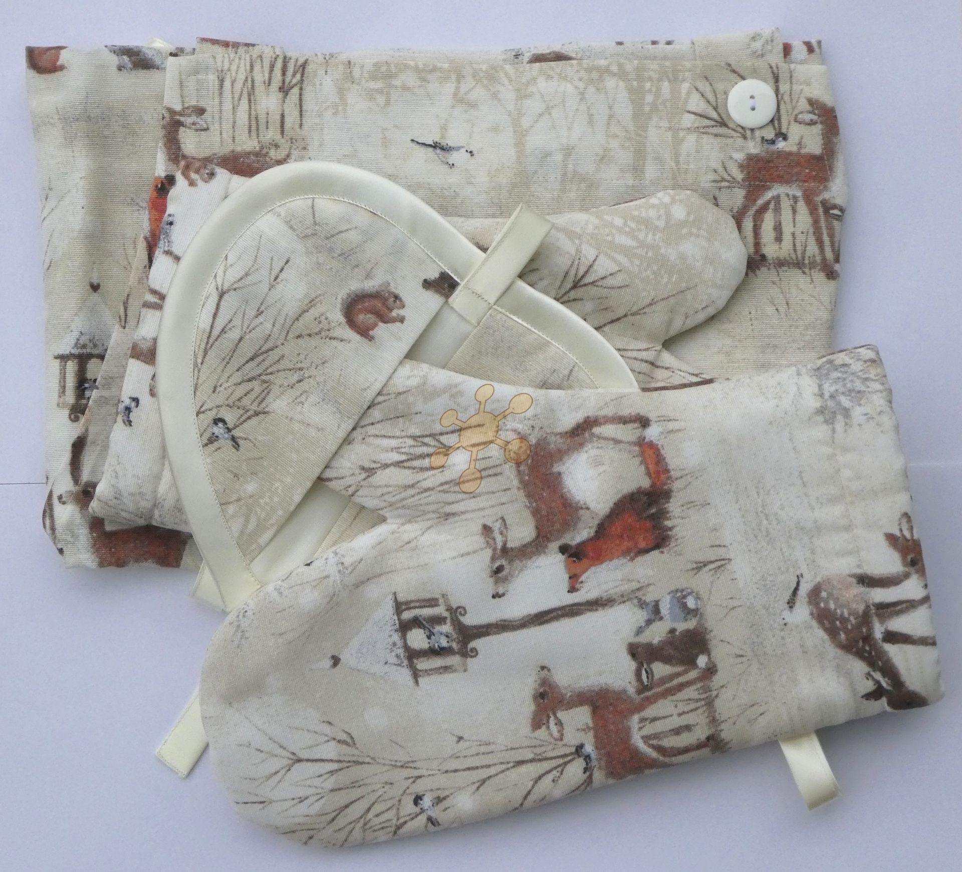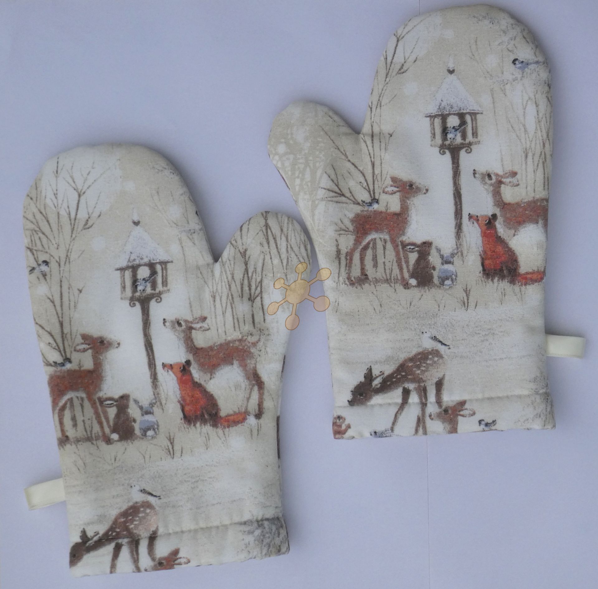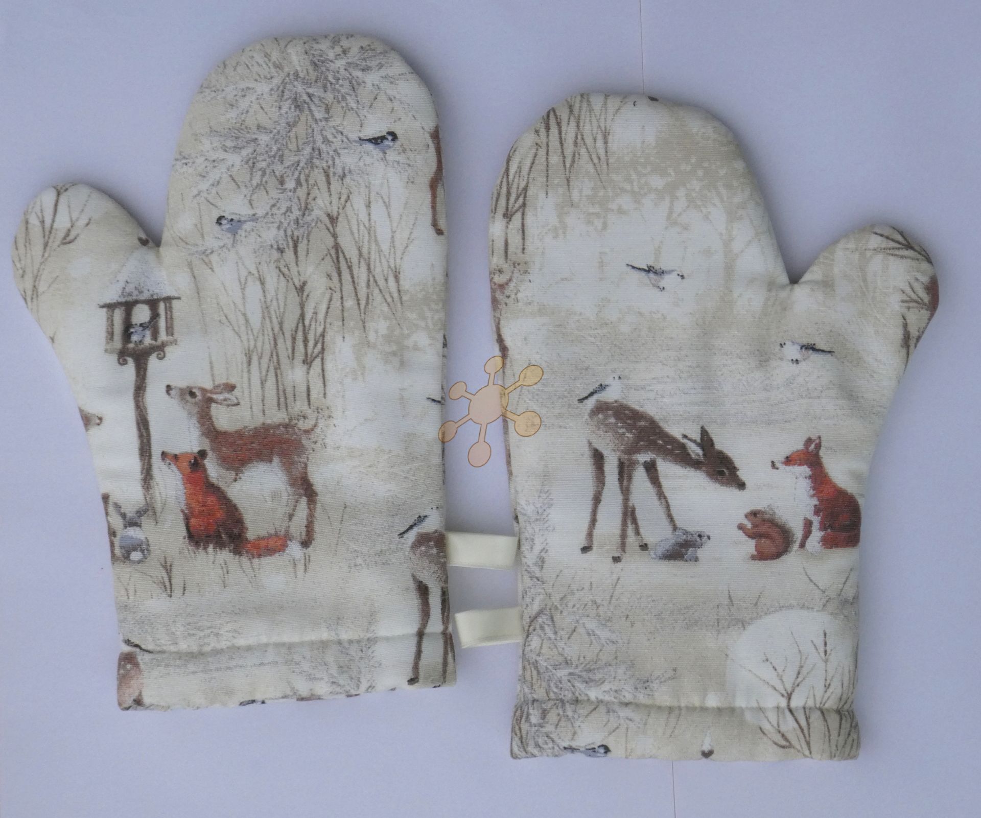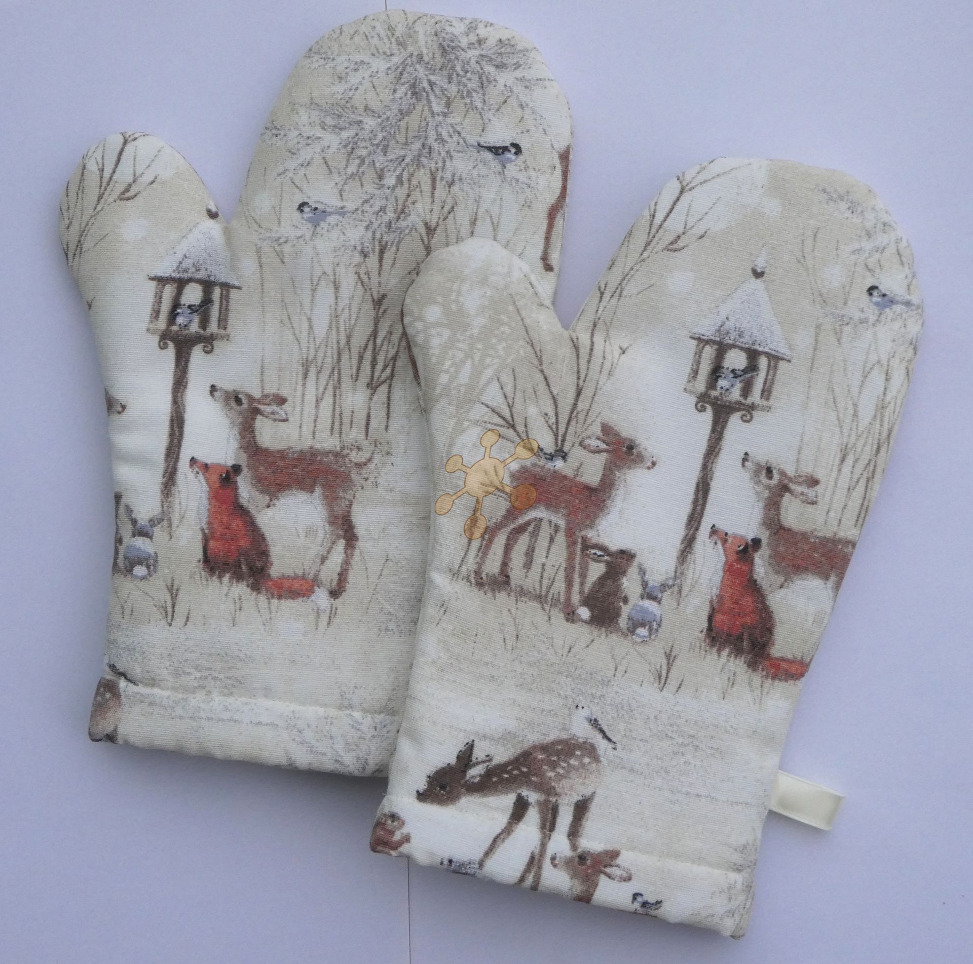 Skvelý pomocník do kuchyne, zvieratká v zimnom lese, zmesová látka, zloženie 60% bavlna + 40% polyester, podšité smotanovou bavlnou, výplň 2x fleece, smotanové saténové uško.