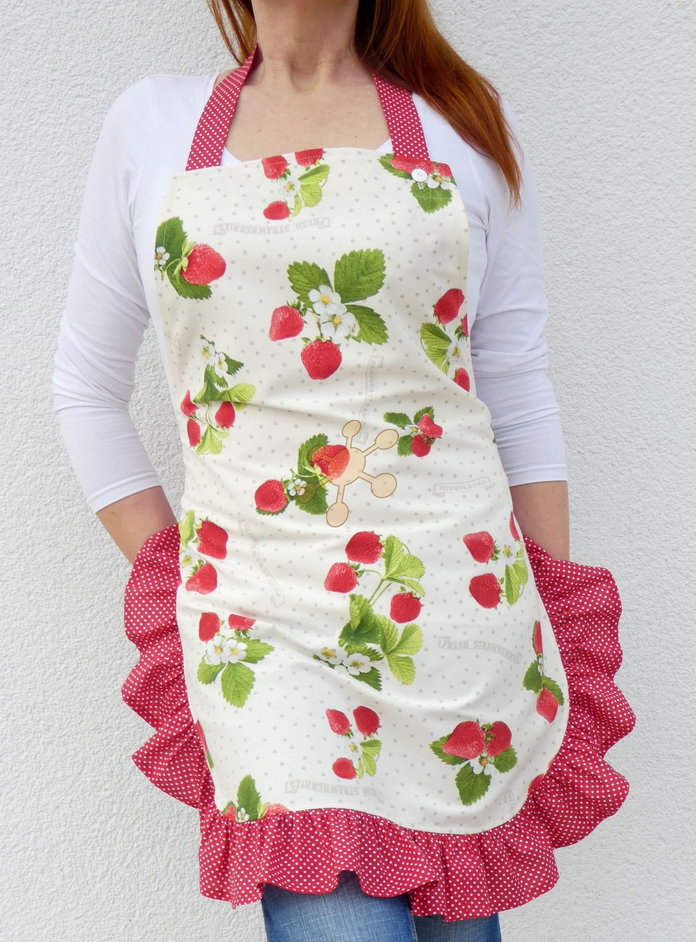 Voňavé jahody na smotanovom podklade, zmesová látka čiastočne vyzrážaná parou 75% bavlna + 25% polyester, 2 gombíky pre lepšie nastavenie veľkosti, červený bodkovaný volánik a mašle 100% bavlna. Veľkosť : dĺžka 82, šírka 74, hruď 28 cm, fotená na výške 174 cm.