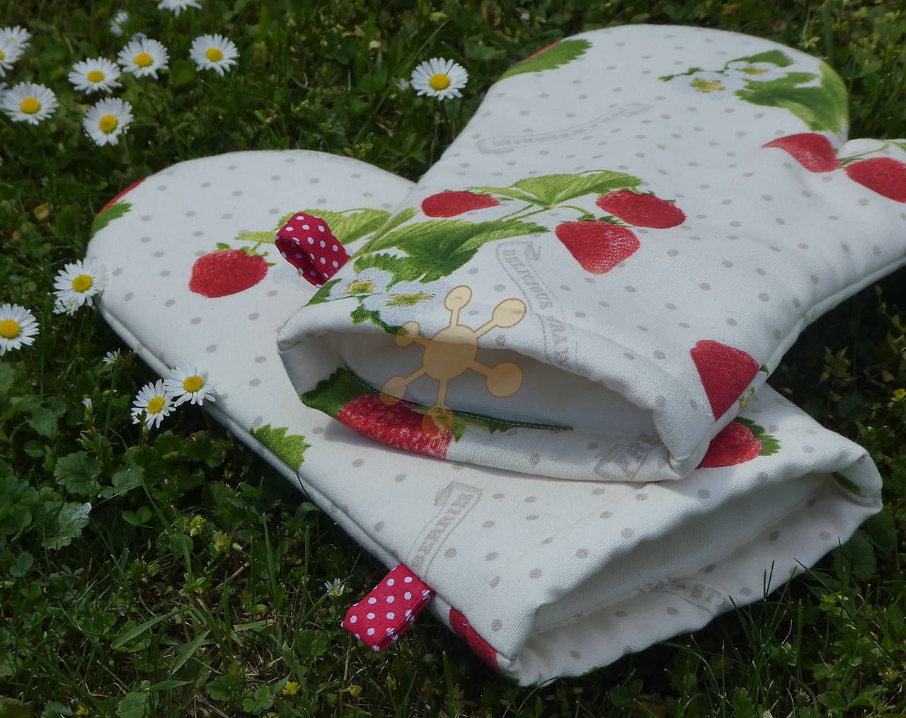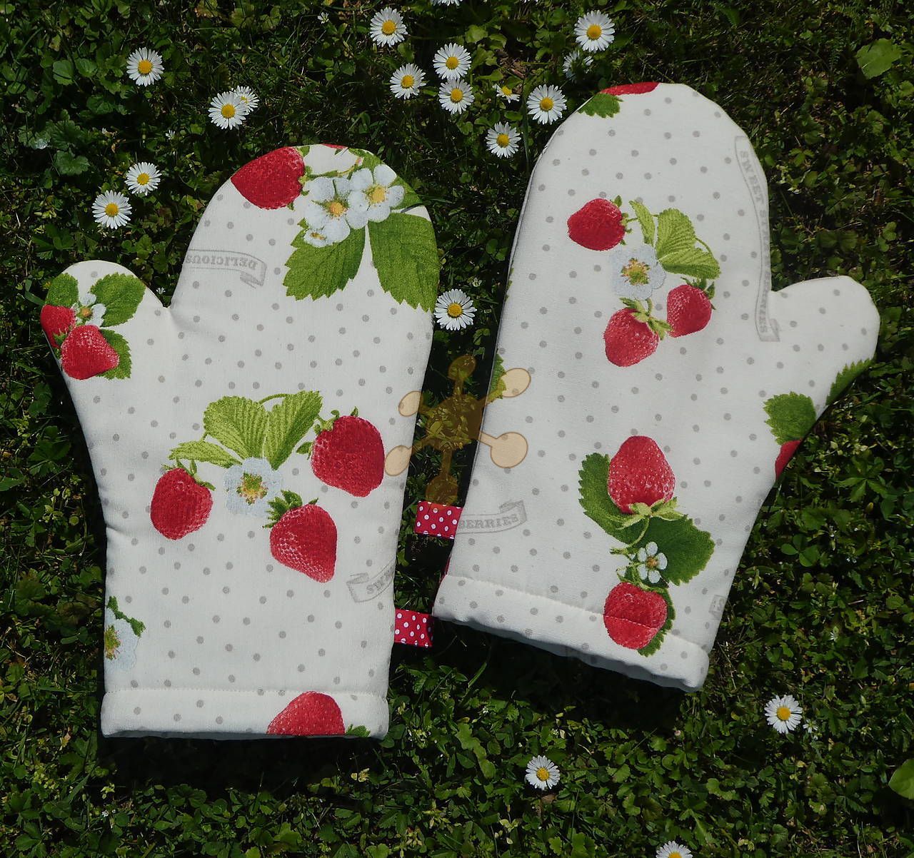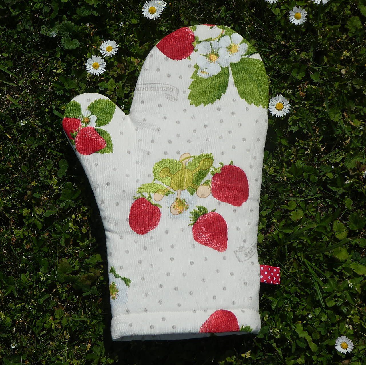 Kuchynská rukavica ušitá z látky Voňavé jahody na smotanovom podklade, zmesová látka čiastočne vyzrážaná parou, 75% bavlna + 25% polyester, podšitie 100% bavlna, vnútro 2x fleece, uško na zavesenie. Rozmer 20 x 30 cm.