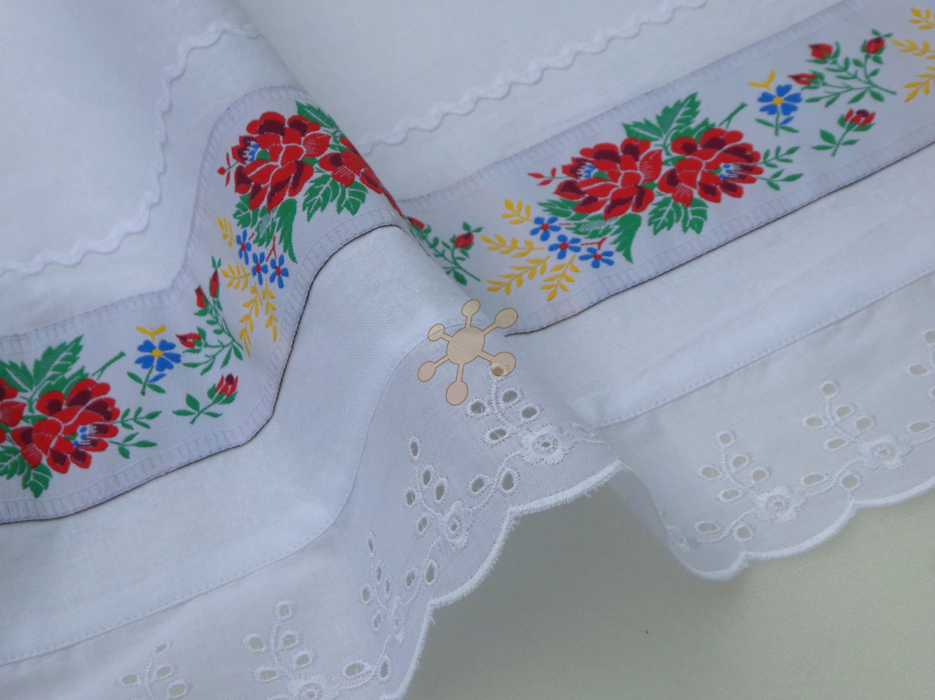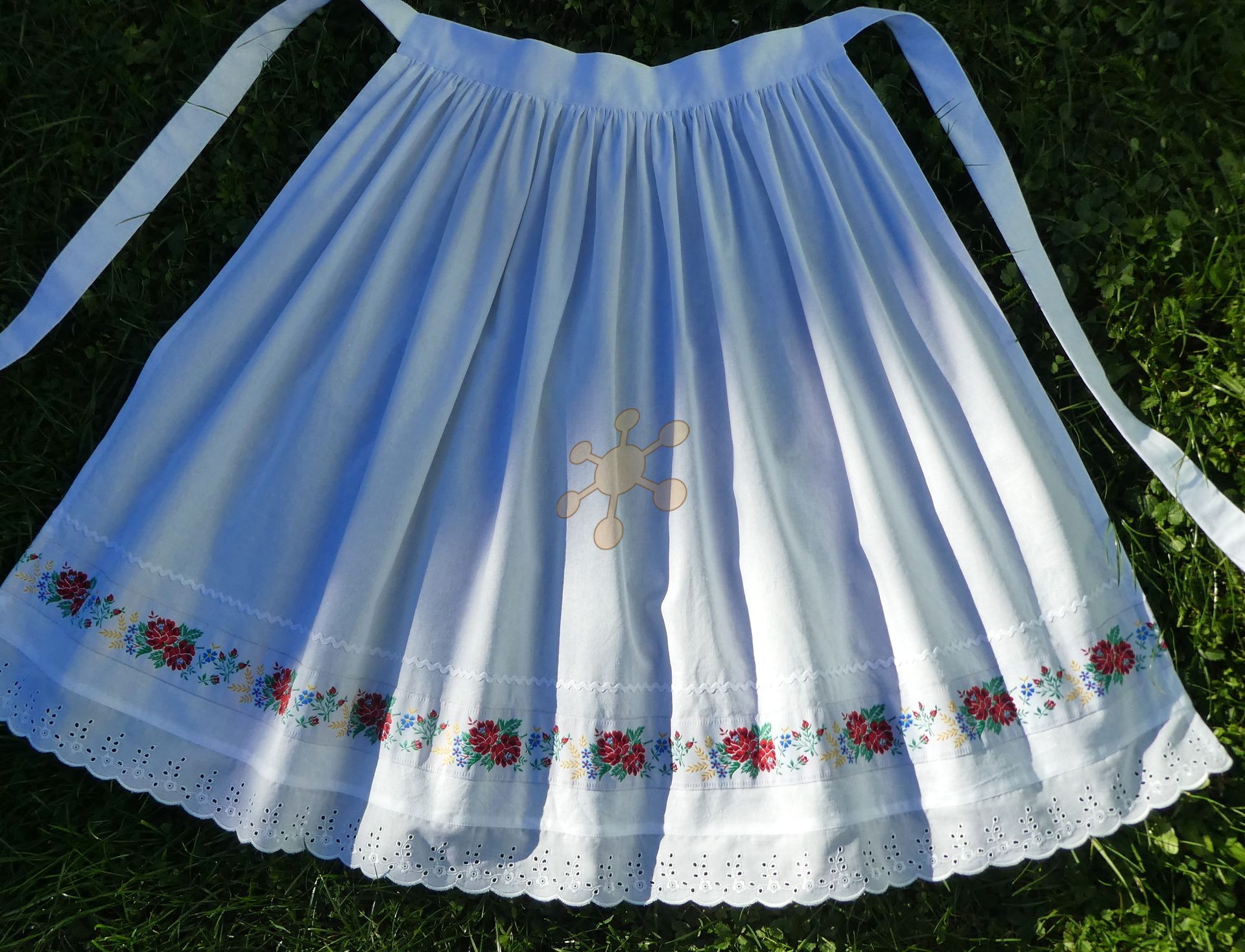 Zásterka na suknicu, veselicu, do kuchyne i na čepčenie. Ušitá z vyzrážanej 100% bavlny, 200 g, dozdobená bavlnenou madeirou, krojovou stuhou a vlnovkou.