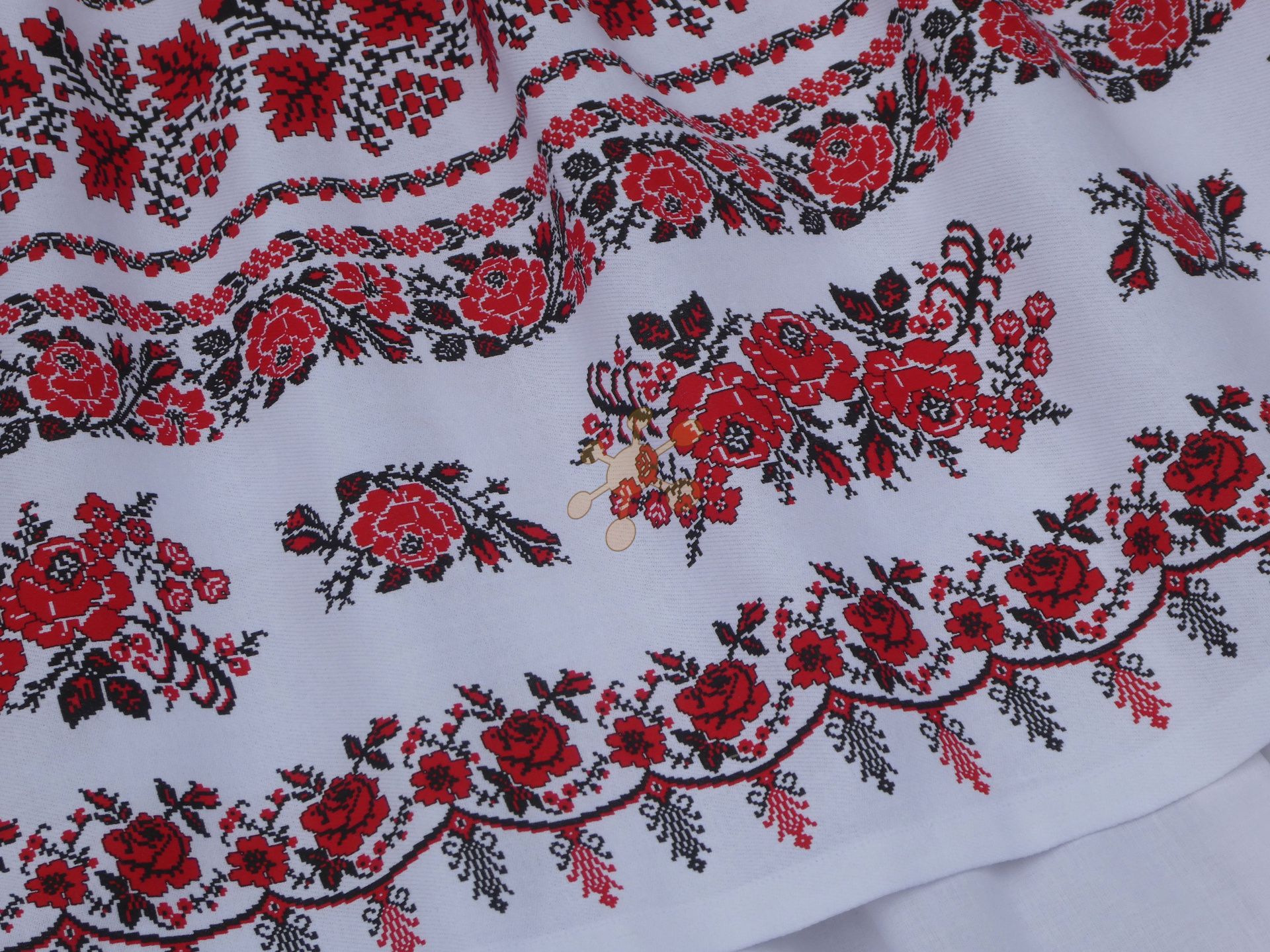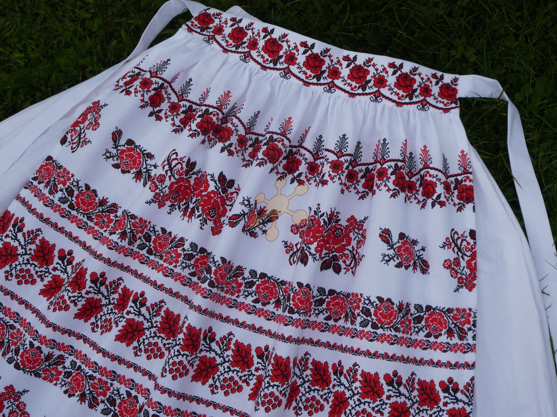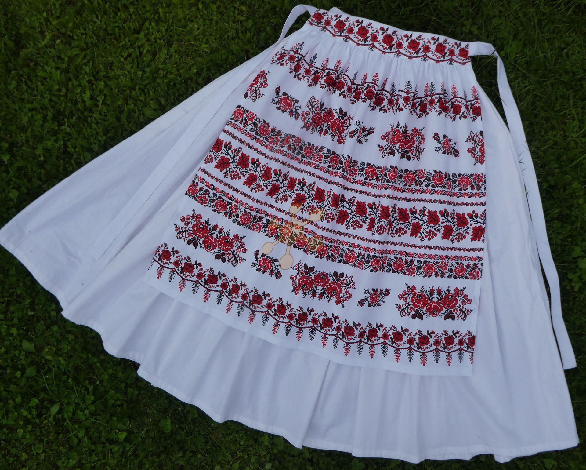 Zásterka na suknicu, veselicu, do kuchyne i na čepčenie. Ušitá z vyzrážanej 100% bavlny, látka Vyšívané bordúry ruží, v skutočnosti ide o krásnu potlač ľudových vzorov v pruhoch, gramáž 175. Šnúrky z bielej bavlny, 145 g.