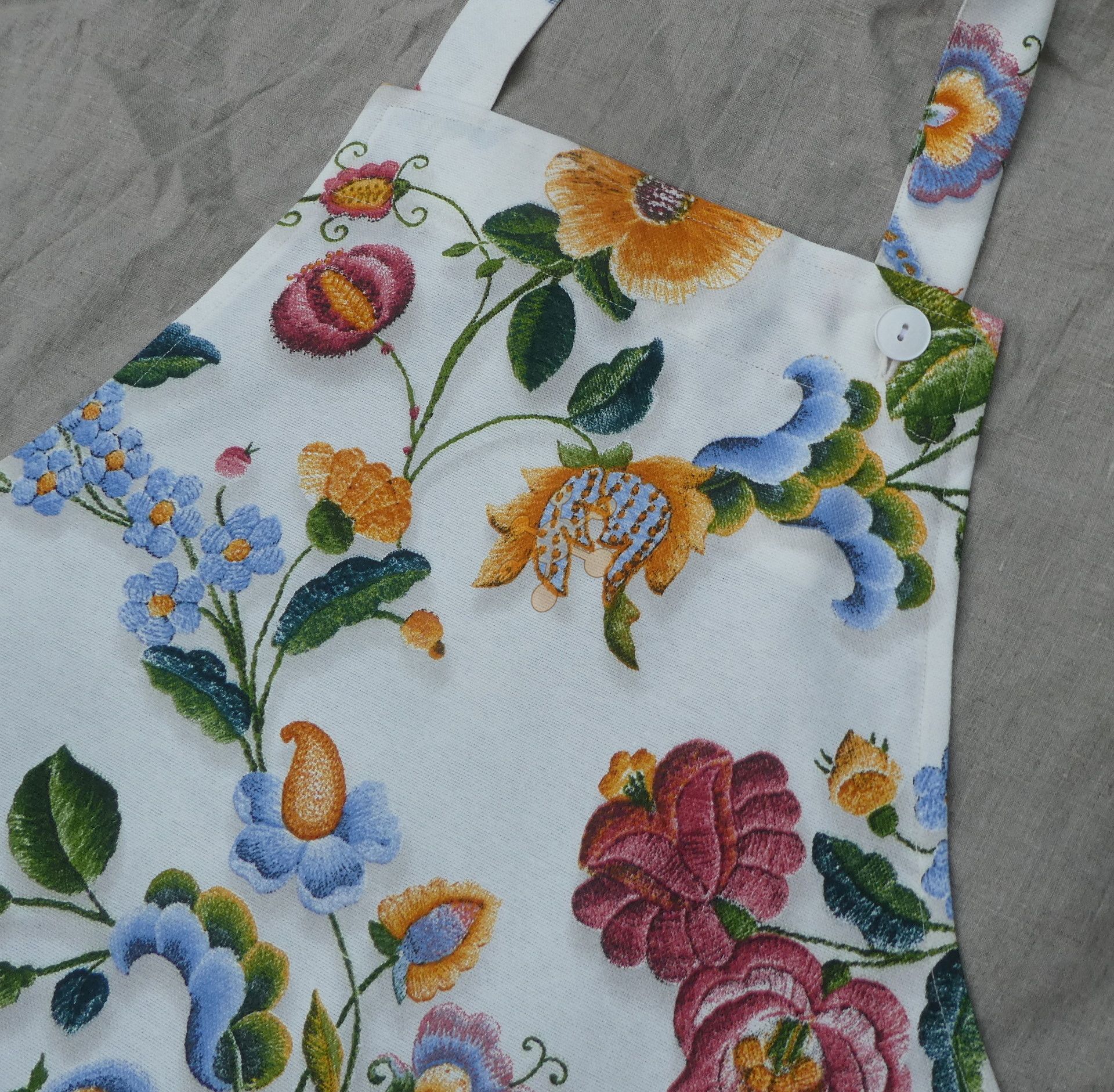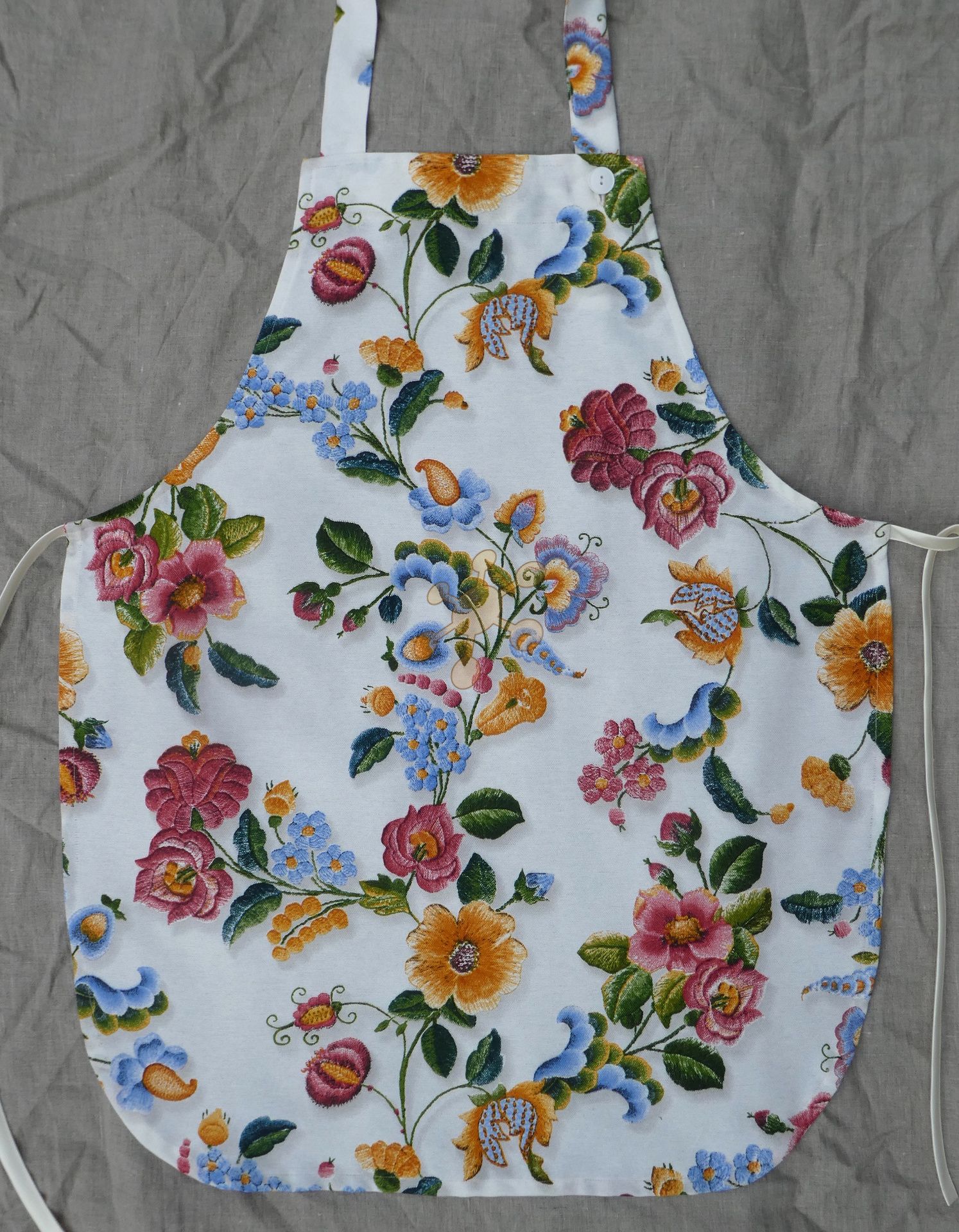 Dámska zásterka, pevnejšia bavlnená látka 210g, s potlačou kvetov plne vyšívaných. 2 gombíky pre lepšie nastavenie veľkosti. Látka čiastočne vyzrážaná parou. Uväzovanie na saténové šnúrky. Rozloženie vzoru môže byť málilinko posunuté, nakoľko stále došívam tieto zásterky... Na foto: dĺžka 82, šírka 67, hruď 28 cm, fotená na výške 174 cm.