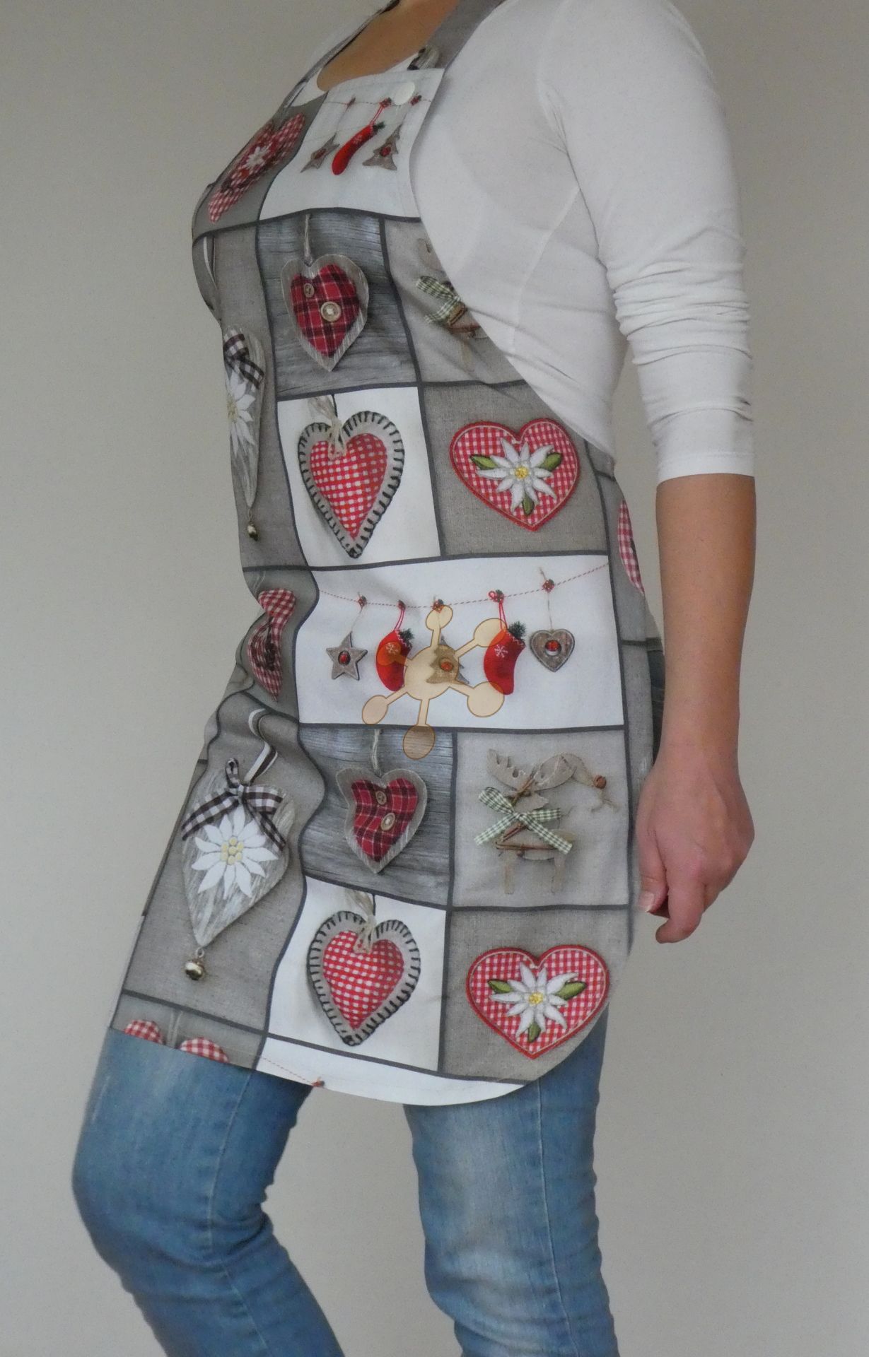 Elegantná aj v kuchyni... Zaláskovaný dizajn pre sviatočné chvíle, digitálna potlač srdiečok a vianočných obrázkov, vyzrážaná 100% bavlna, 210 g/m2, 2 gombíky pre lepšie nastavenie veľkosti, vzadu viazanie na mašličku. Prať na 40°C.