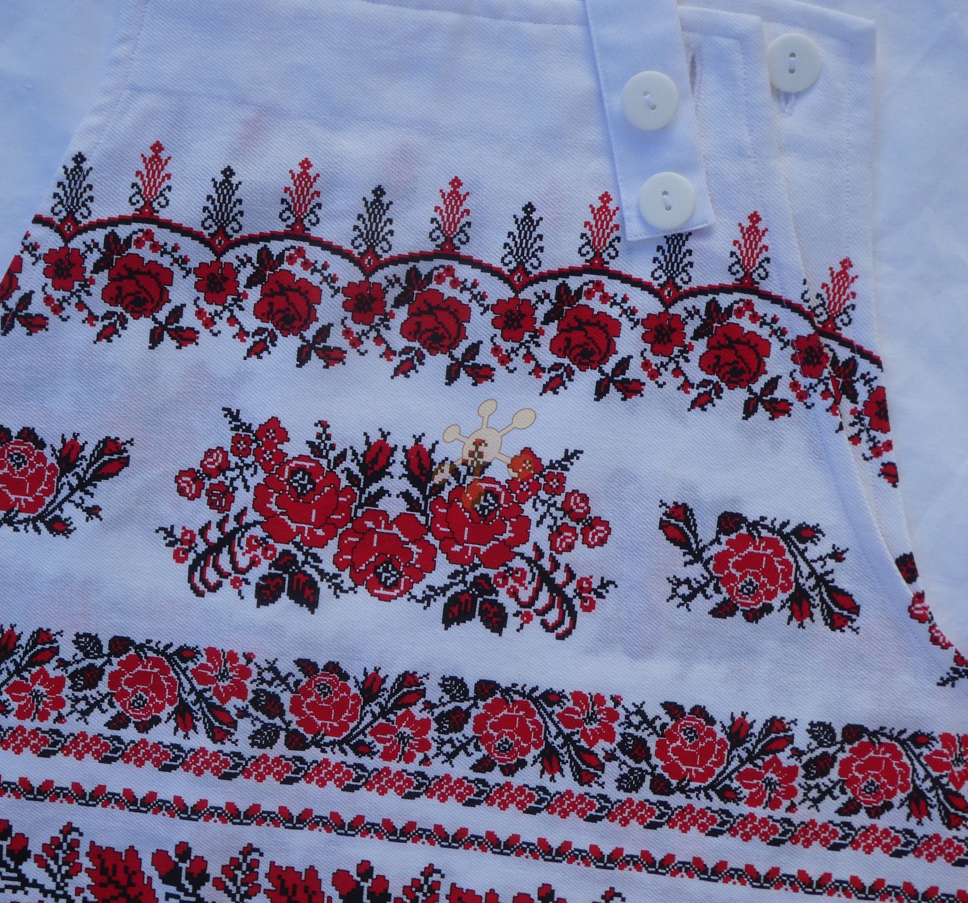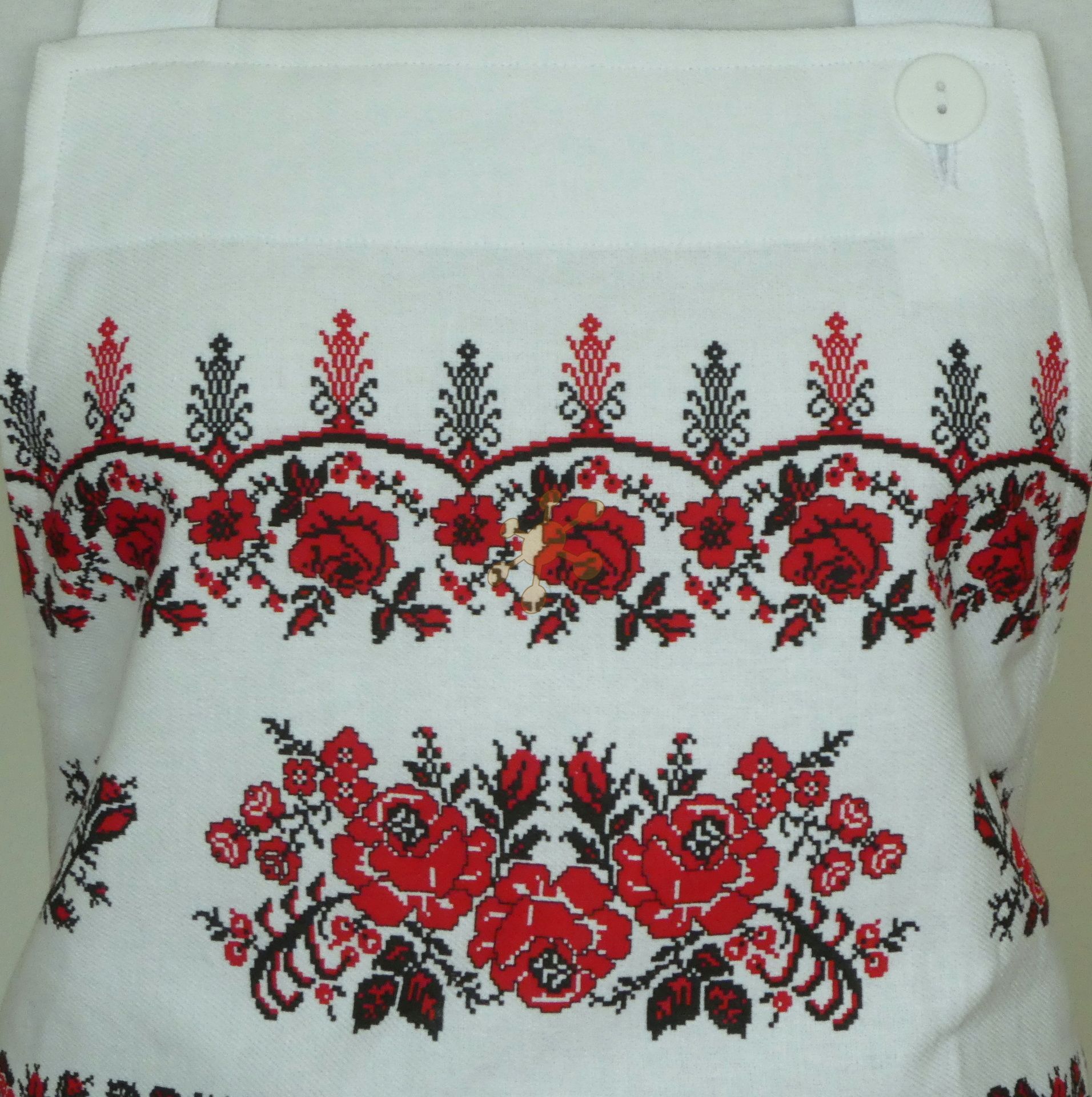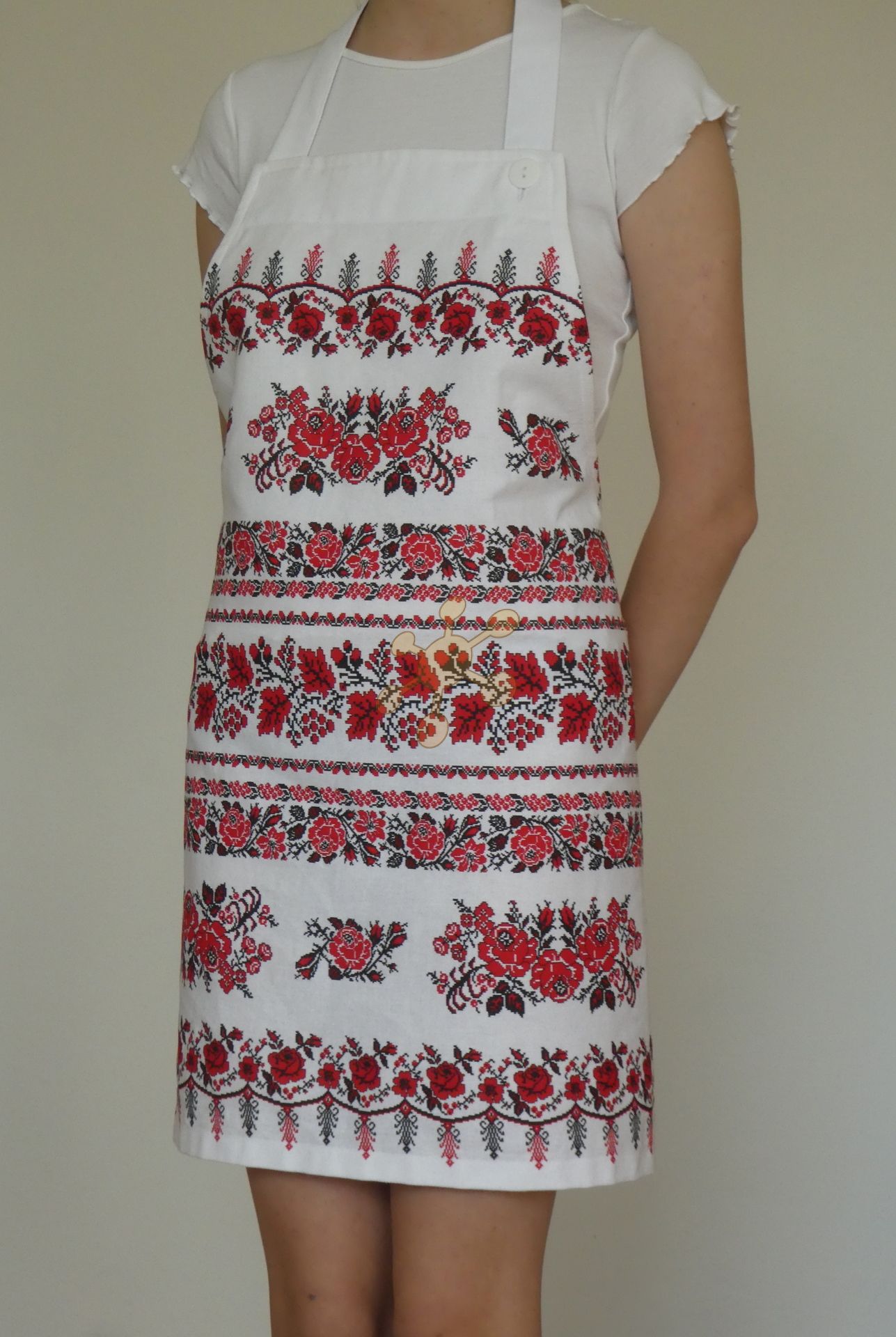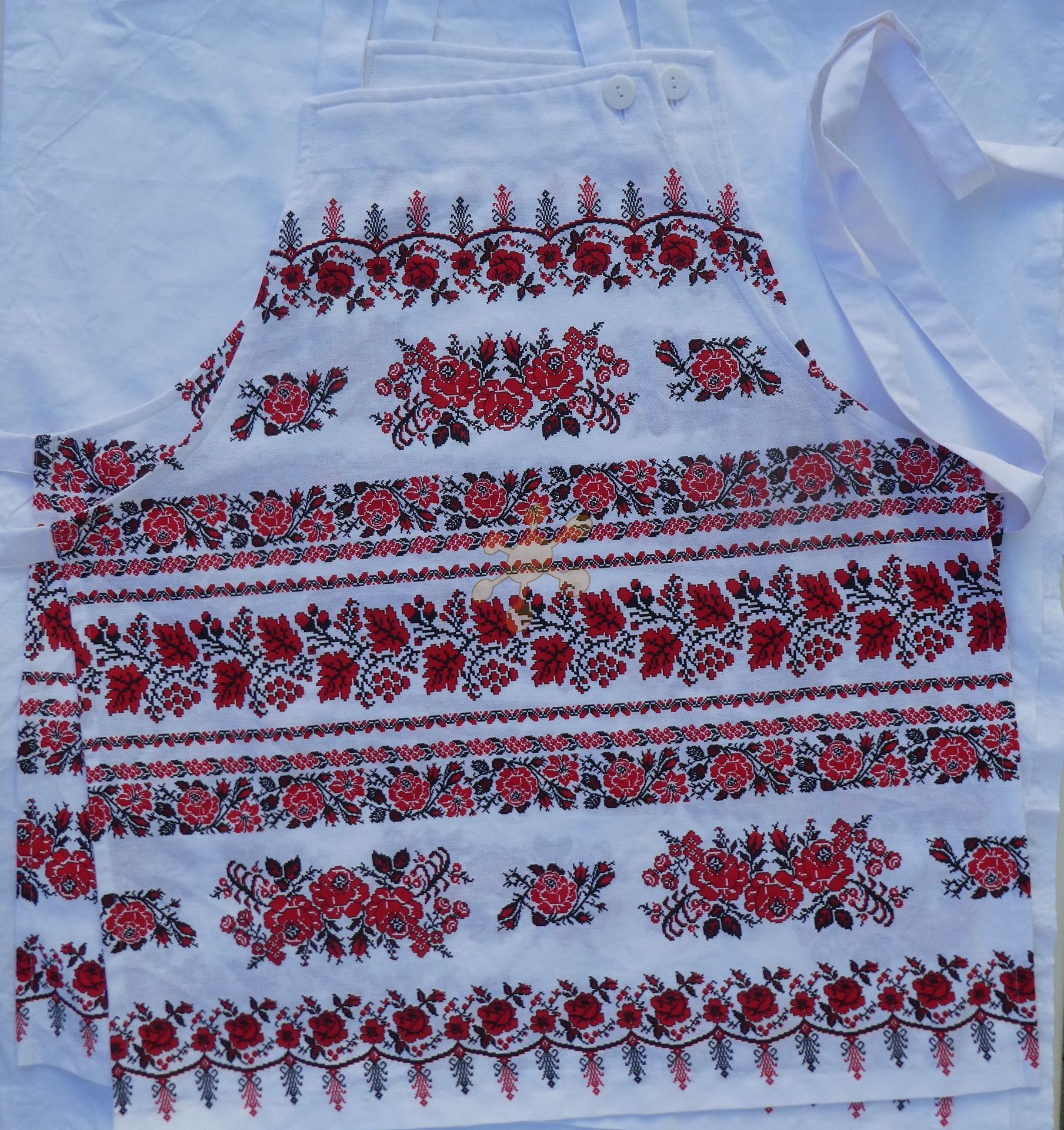 Originálna zásterka, ušitá z vyzrážanej 100% bavlny, potlač vzoru evokuje ľudovú výšivku, gramáž 175. Šnúrky z bielej bavlny, 2 gombíky pre lepšie prispôsobenie veľkosti.
